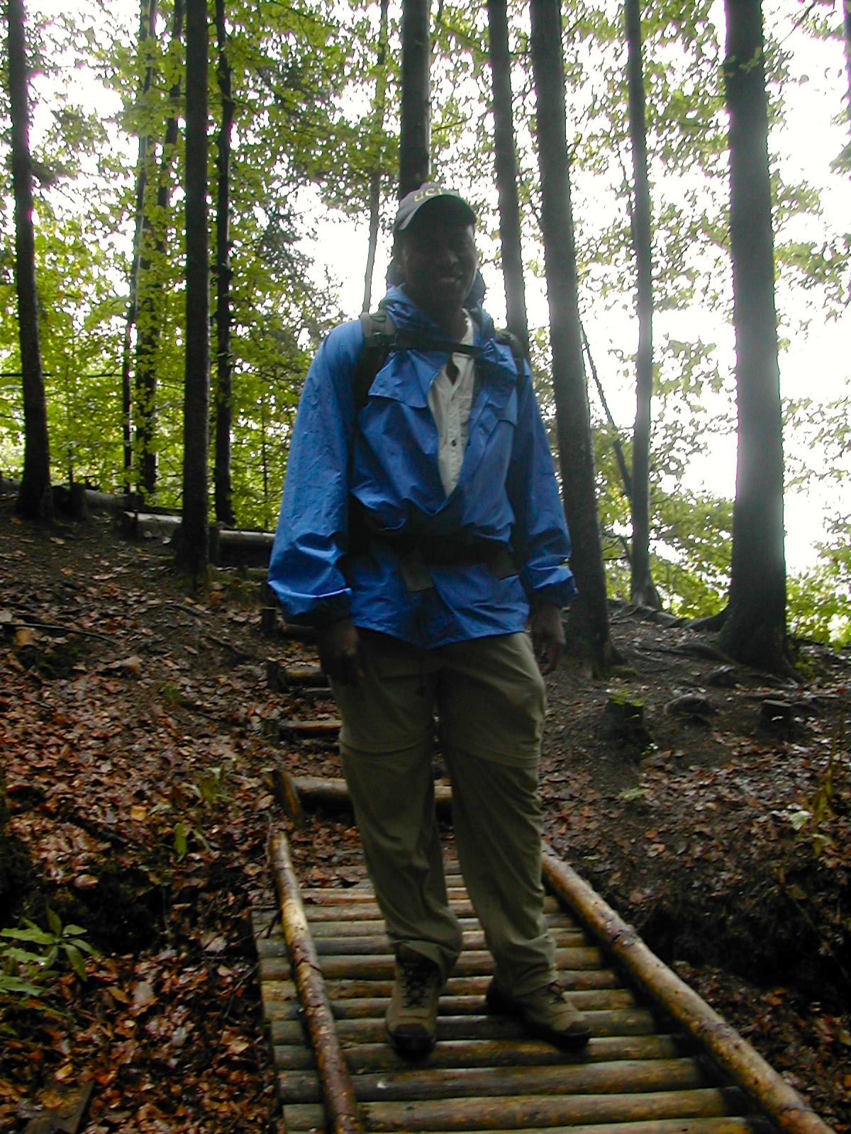 Readers may recall from mine and Joanna’s trek along this portion of trail in 1984 the difficulty encountered on this undulating trail filled with ravine and creek crossings covered by wooden bridges. The round slippery logs that made up each bridge posed a challenging crossing, one best handled cautiously. At least on this trek we were only carrying roughly 25 pounds apiece instead of the 40-50 Joanna and I had handled, but it was still an exhausting stretch of trail.