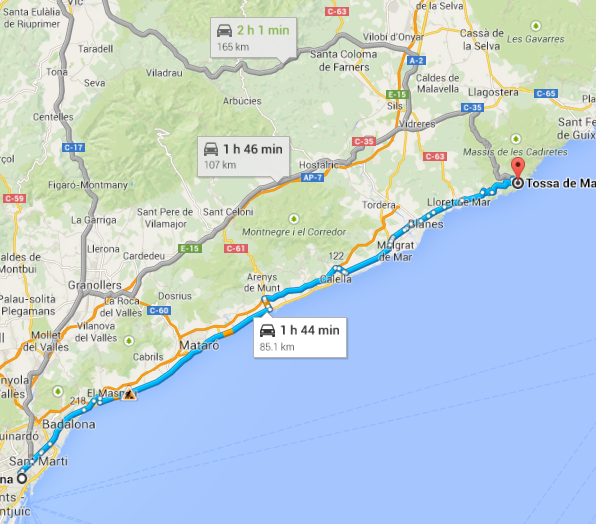 The first part of the drive to Tossa took us along the coast, again cruising through beach towns and settings. We turned inland for a bit, then back to the shore as we approached town. Francois had texted us that traffic out of France was horrendous and that he was going to be delayed, our original plan being to meet him at the house to see if the arrangements would work for all of us.