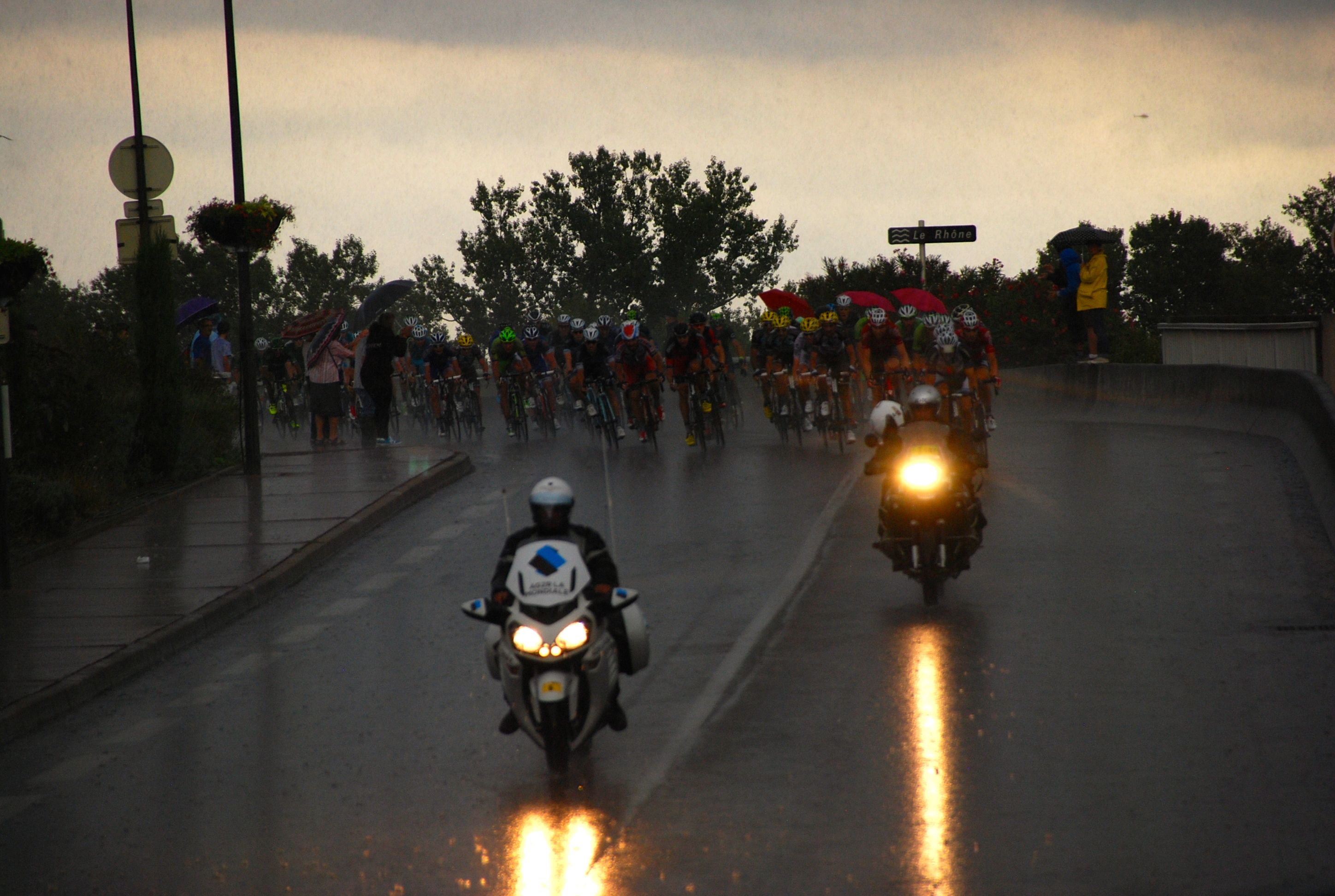 I couldn’t get the camera out in time and they flashed on by.  Gone in a second or two.  Prepared I waited for the peloton to come through and not long afterwards, the same energy crested, the same types of cars and motorcycles came by and here came the riders.  I snapped as many pictures as I could (would later discover that the Sigma 18-200 lens we purchased for the Nikon is not equipped for low light situations capturing riders speeding by) and when the train finally completed its passage, caught up with Joanna and walked back to the car, soaked to the skin.
