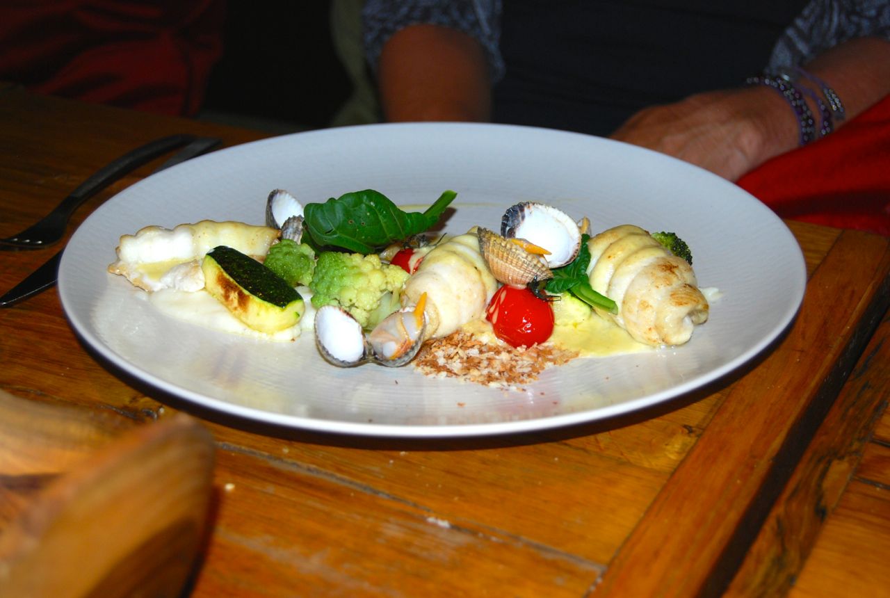 We started with the warm Camembert and mango compote, a delectable Filet Mignon Carpaccio and for main courses, Tom’s signature Meatloaf, Chicken Roulade with Truffle Sauce, and the Nordzee Tongfillet (beautifully cooked and presented sole stuffed with cauliflower). One downside to eating in Europe is the practice of taking leftover food home is unheard of. You must eat all of your food, which can be a problem if the portion sizes are large.