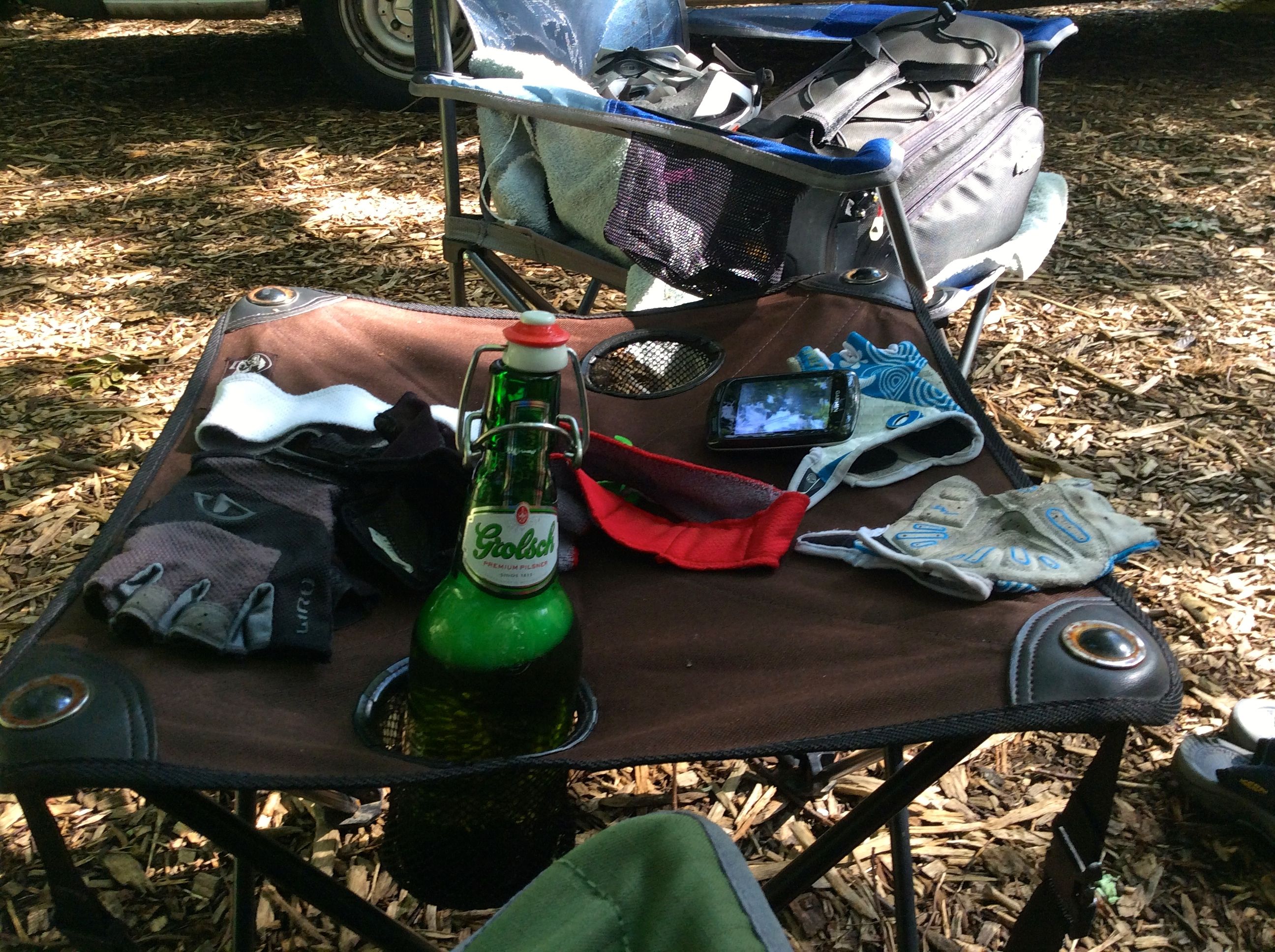We made it back to camp, stopping at the mini-market there for a couple of beers (Grolsch) with which to rehydrate, then relaxed for the rest of the afternoon before making a run to Dirk’s for dinner supplies. Another fine meal in camp ensured. Another inexpensive bottle of wine got consumed. We were happy campers.