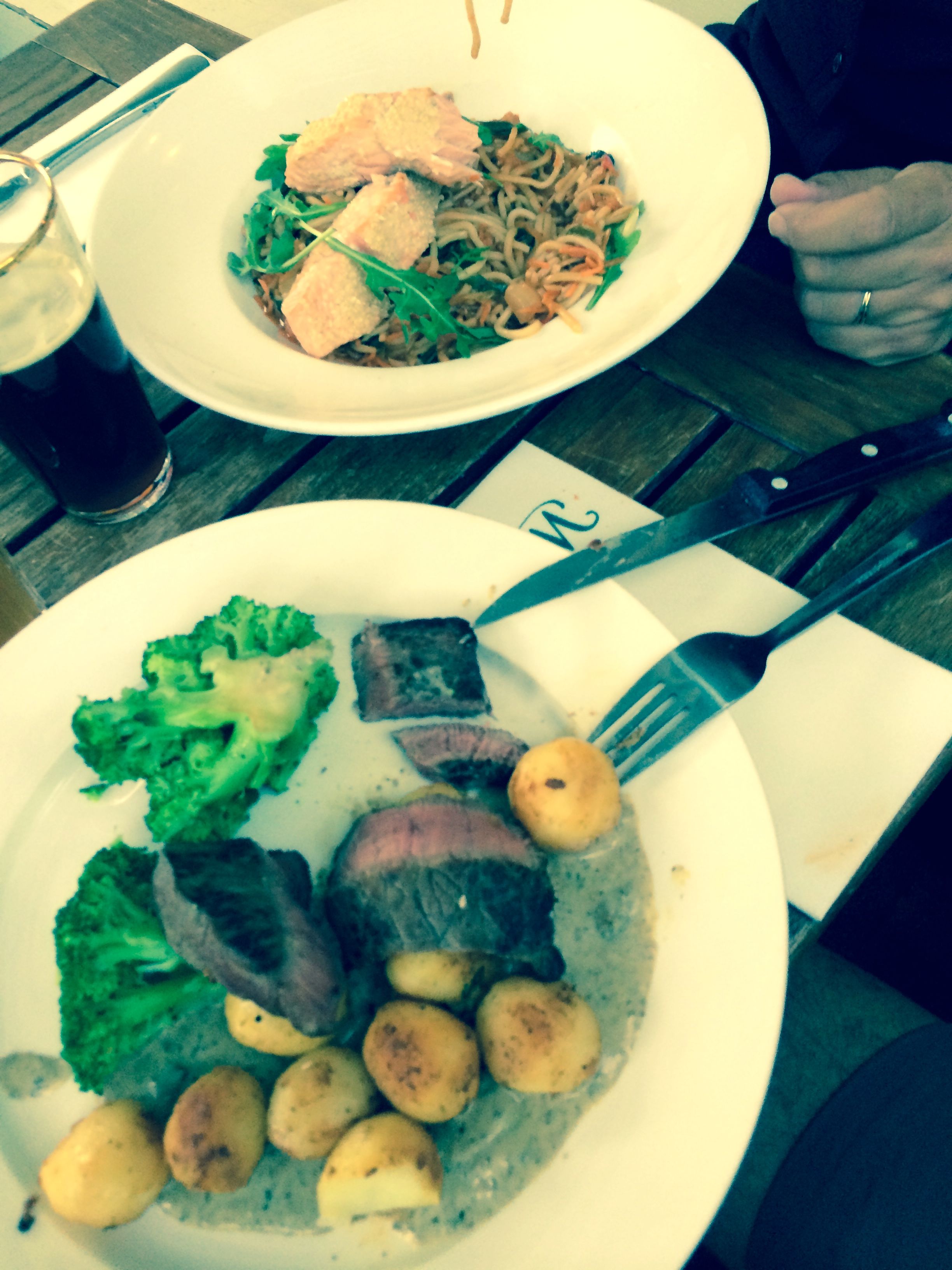 We ordered some beers and a delicious starter of zucchini strips wrapped around a mixture of cooked pine nuts and tomato. Our main courses were equally good, my steak with pepper sauce and potatoes and Joanna’s winning dish of the night, Noodles with Sesame Salmon. Chunks of fish cooked just right and tossed in a semi-sweet sauce and noodles. We finished with Winkel’s much acclaimed apple pie and ice cream and then received the biggest treat of all, the bill.