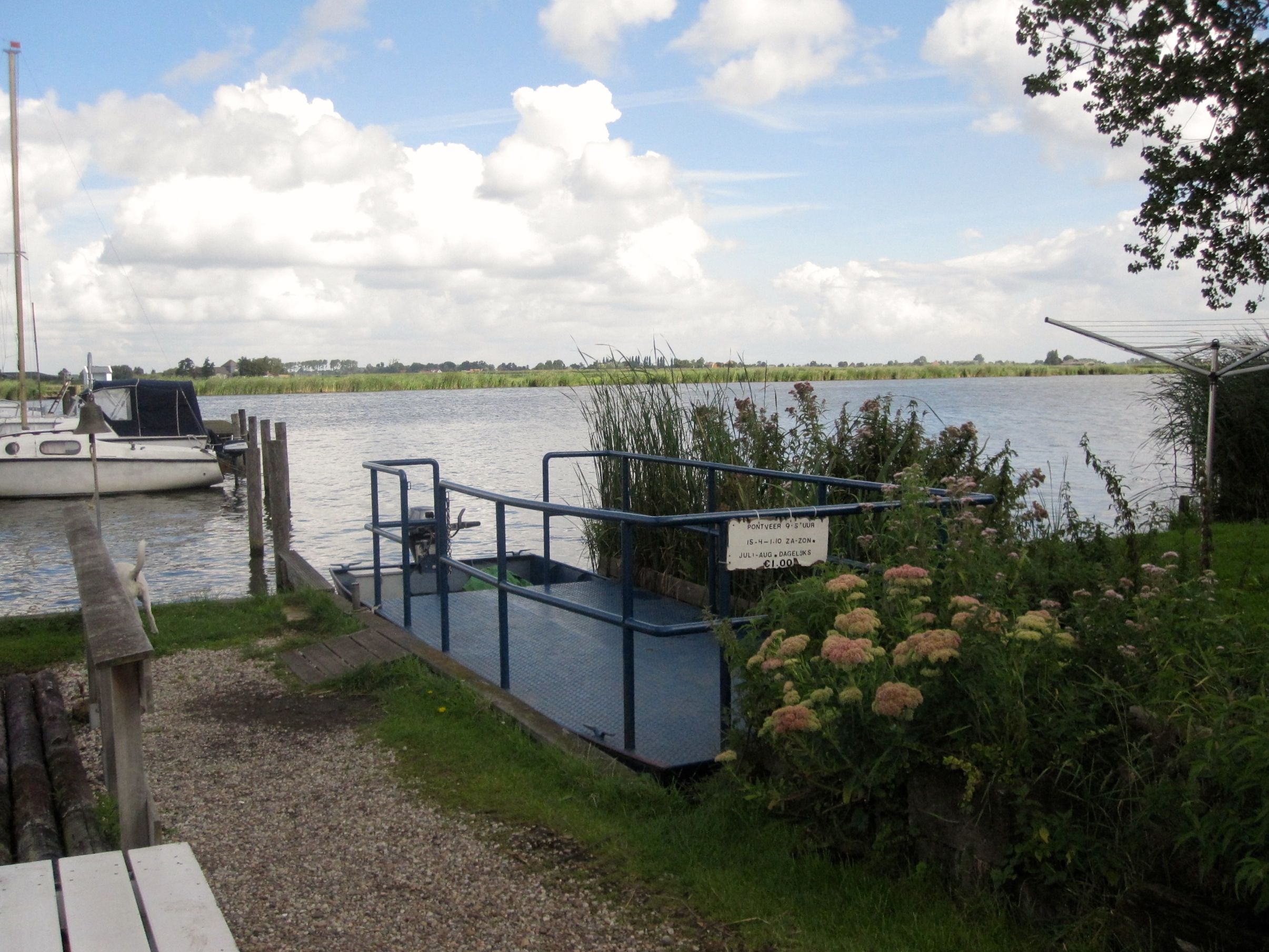 It turns out that you have to take a small ferry across a tiny body of water to get to the field on the other side to resume the route. This was not immediately apparent, again a problem with not being able to read the signs that were posted, but fortunately the ferry operator, a woman about our age, came out of her house and let us know that she would take us across for one Euro apiece.