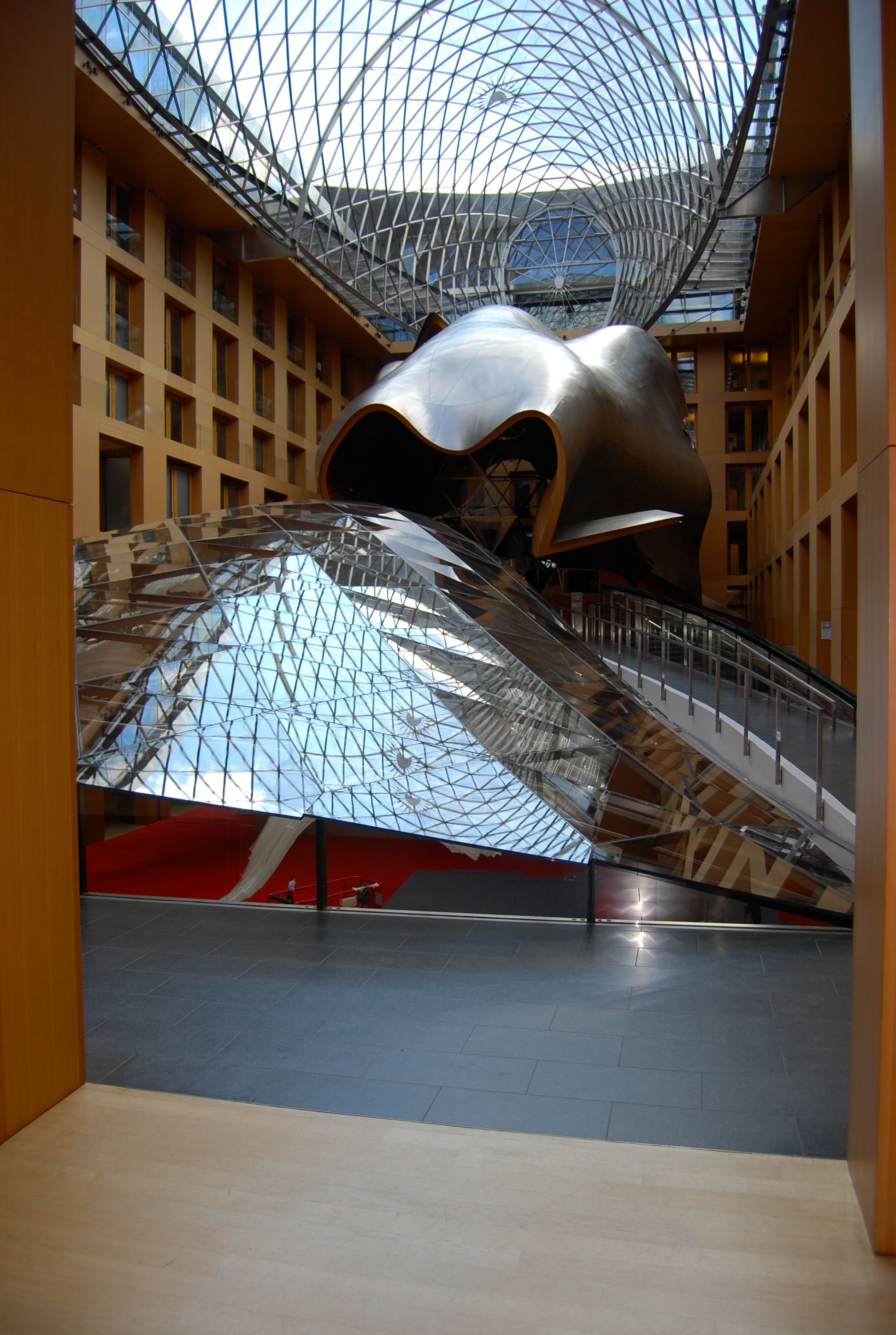 We stopped to glance at the DZ Bank Building, designed by Frank Gehry, famous for Bilbao’s Guggenheim Museum and Los Angeles’ Walt Disney Concert Hall, among others. With a plain exterior so as not to upstage the Pariser Platz, its undulating interior is like a big, slithery fish. From there we walked around the corner and behind it and other buildings (the US Embassy and the Hotel Aldion) to visit the Memorial to the Murdered Jews of Europe.