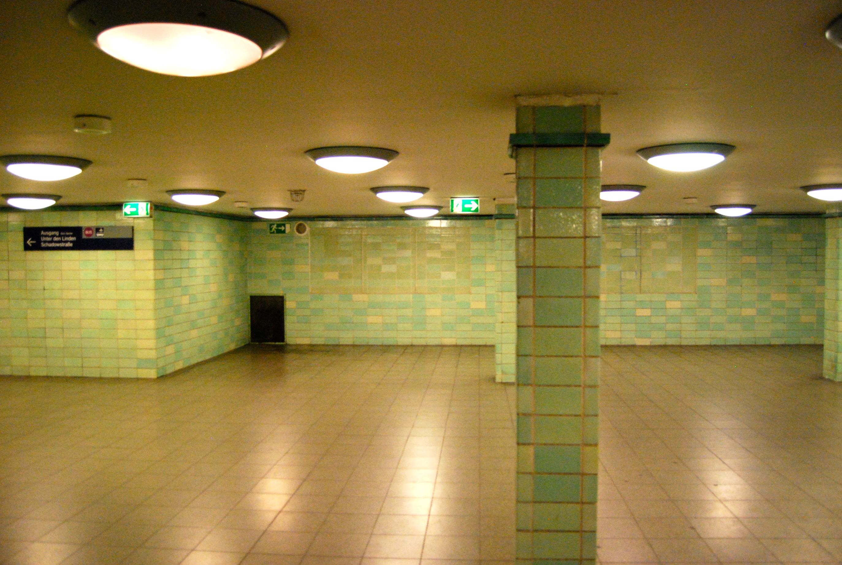 We continued walking down Unter den Linden, first pausing at the Brandenburger Tor S-Bahn station one of Berlin’s former ghost subway stations. During the Cold War, most underground train tunnels were simply blocked at the border. But a few Western lines looped through the East and then back into the West. The East Germans allowed trains to go through at a price (to get hard currency) but they could not stop. Today the stations seem frozen in time, looking much as they did when built in 1931, with dreary old green tiles and original signage on ticket kiosks.