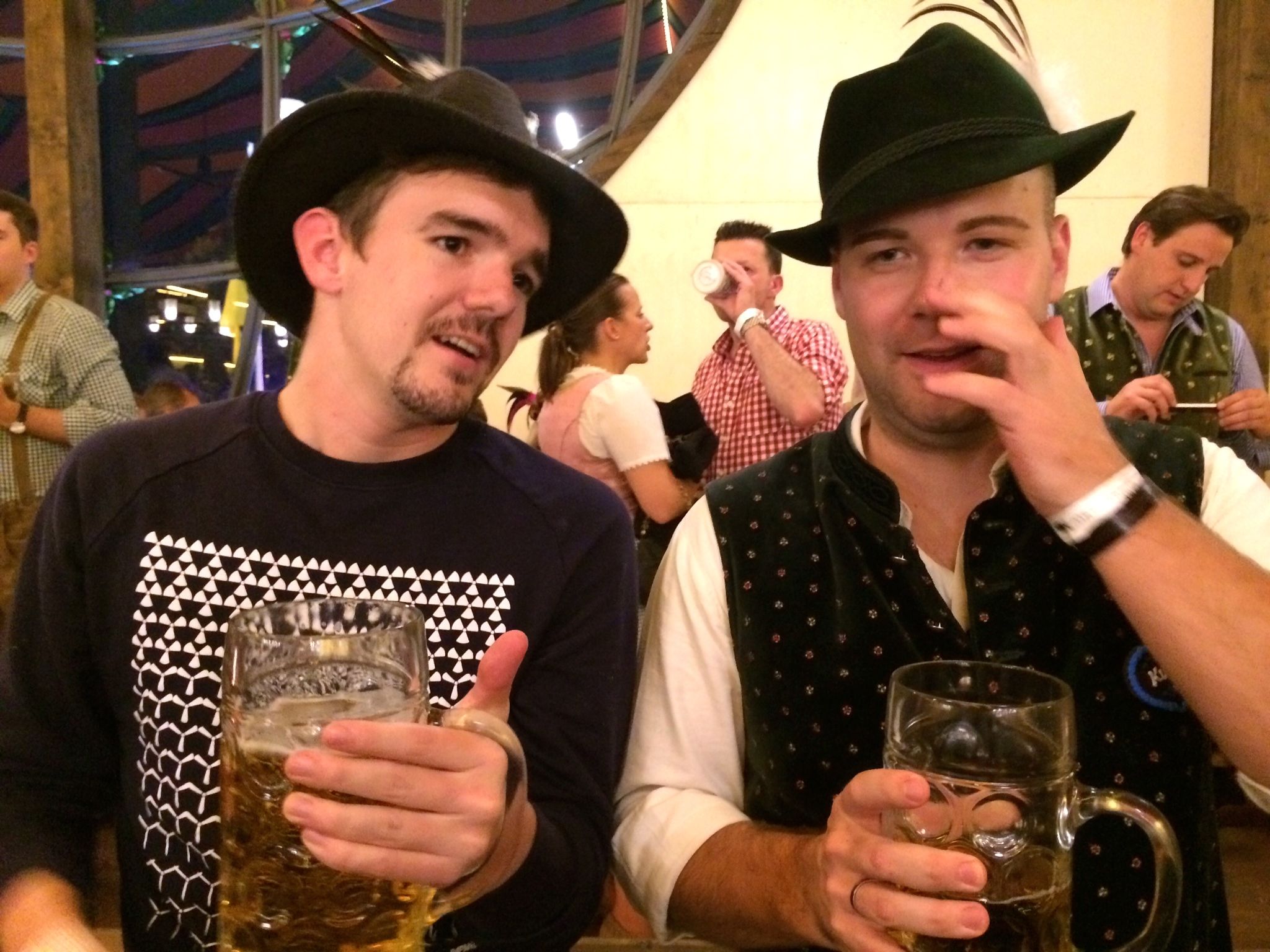 The tents close at 11:00pm and we all feared that we wouldn’t have enough time to drink to excess and just generally carry on, but we were wrong. As the evening progressed even more food would come to the table, first an entrée plate apiece of roast pork and wurst, followed up by three tiered desert trays with various German sweets. And more beer, much more beer; one’s stein was never empty. We were seated upstairs and as the evening wore on it got progressively warmer, particularly so as we migrated from sitting at the tables to standing nearby, conversing, singing, and drinking more beer.