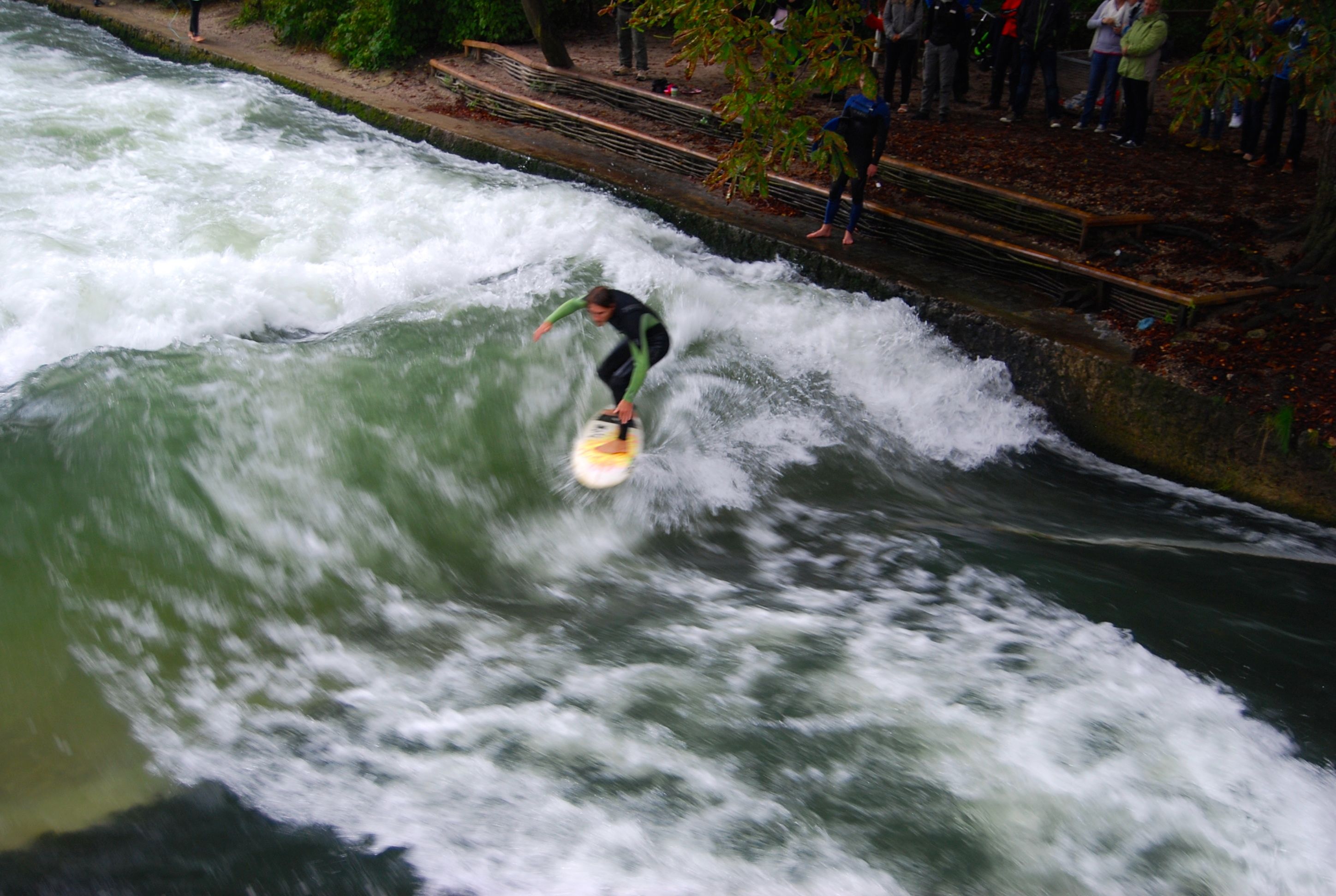 We finished the tour by walking over to the Englischer Garden once more to check out the surf spot at the canal. As with the other days we’d visited it was crowded and the surfing was good. All the space needed to make it California was a loudspeaker playing the Beach Boys. By this time the rain had stopped and the sun had come out, providing us with glorious views.