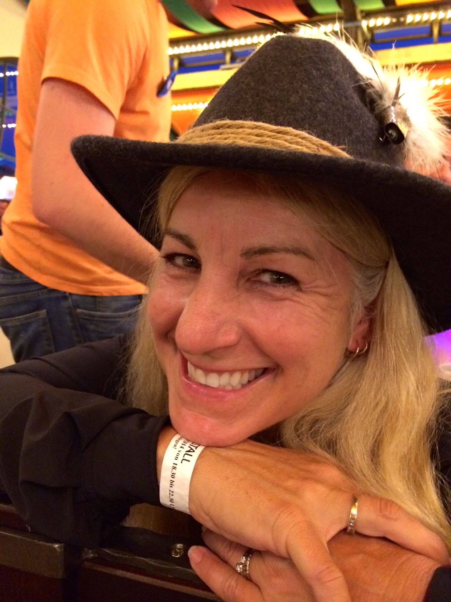 We returned to the Sheraton, cleaned up and relaxed in anticipation of our evening ahead, and then gathered in the lobby to make our way to Fest. The U4 was crowded with folks in typical fest garb; Lederhosen, felt hats, and vests for the men and Bavarian Dirndl style dresses for the women. This was the first day of fest and there was a keen sense of anticipation in the air, both in car and as we entered the fest grounds (Theresienwiese).