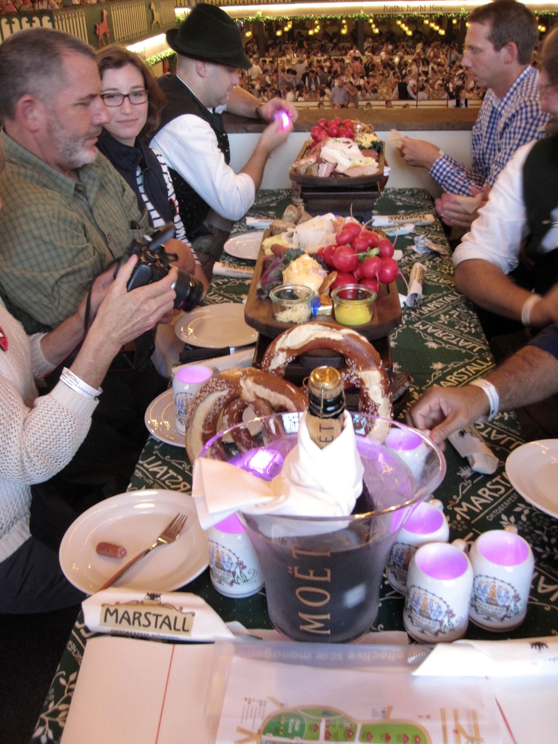 We finally made it in and to our tables (a friend also had one next to us) and upon arrival discovered that Marcus had arranged for two large appetizer trays and a magnum of champagne. We started in on the food; an assortment of German meats, soft cheese spread, infamous large sliced salted radish, pretzels and bread. A waitress came by and we ordered our first round of what would be many liters (Mass) of Spaten Oktoberfest beer.