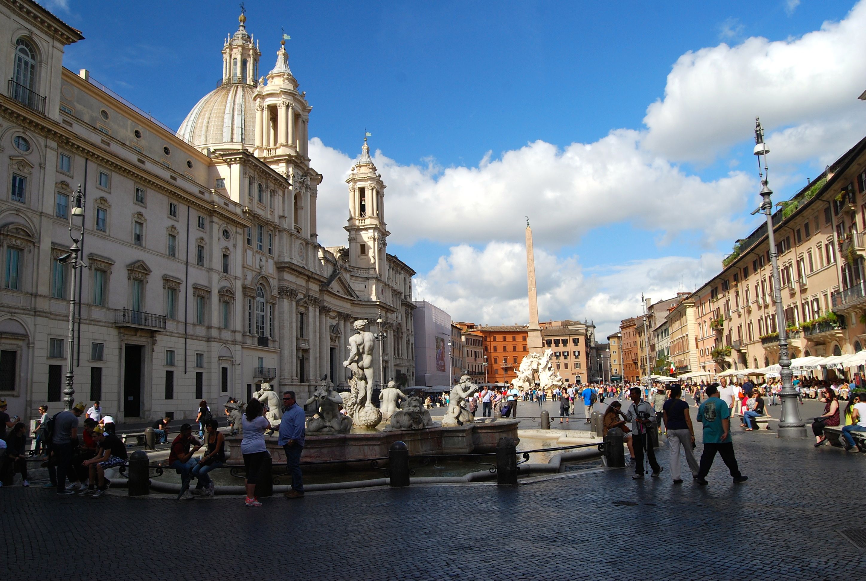The square is dominated by the Gian Lorenzo Bernini’s Four Rivers Fountain; built around 1650 it represents the four continents known at the time by their major rivers, the Nile, Ganges, Danube, and Uruguay’s River de la Plata. Directly across from it is the Church of St. Agnes, worked on by Bernini’s former student-turned-rival, Francesco Borromini.