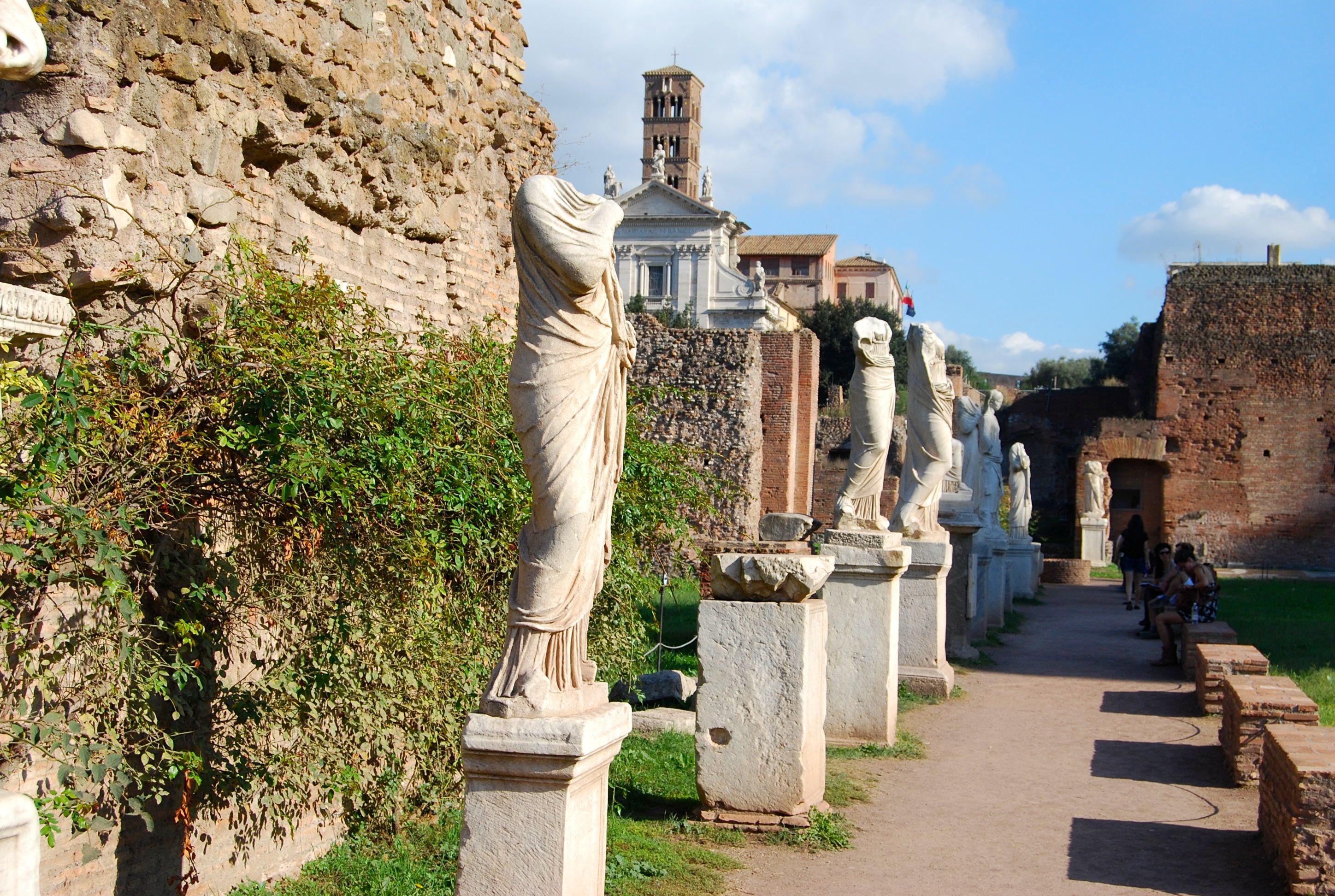 The other major sites at the Forum are the Basilica of Constantine, Temple of Julius Caesar (Tempio del Divo Giulio, or Ara di Cesare), Temple of Antoninus Pius and Faustina, Basilica Aemilia, Temple of Castor and Pollux (These three columns— all that remain of a once-prestigious temple— have become the most photographed sight in the Forum), Caligula’s Palace (Palace of Tiberius), Temple of Vesta and the House of the Vestal Virgins, The Curia (Senate House), Rostrum, Arch of Septimius Severus, Temple of Saturn, and the Column of Phocas.