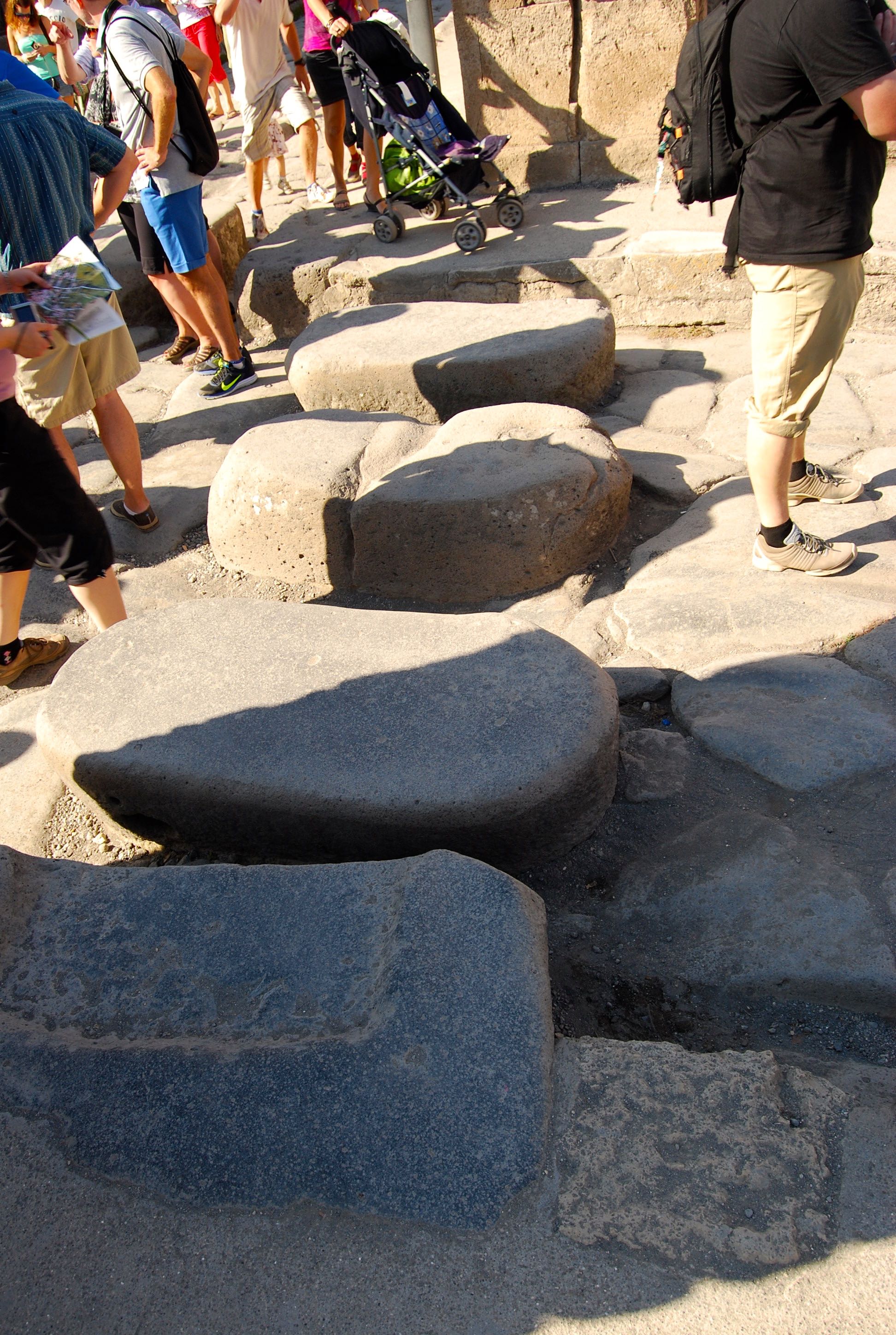 Every day, Pompeiians flooded the streets with gushing water to clean them. These stepping-stones let pedestrians cross without getting their sandals wet. Chariots traveling in either direction could straddle the stones (all had standard-size axles). A single stepping -stone in a road means it was a one-way street, a pair indicates an ordinary two-way, and three (like this) signifies a major thoroughfare.