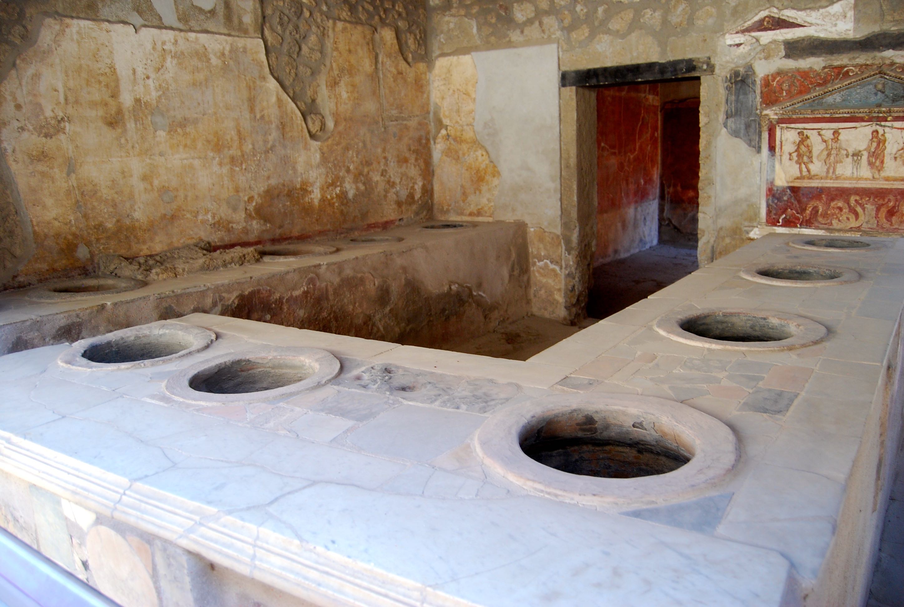 At a typical fast food joint, holes in the counters held the pots for food, each acting like a thermos with a wooden lid to keep the soup hot, the wine cool, and so on. A groove in the stone floor identified where the shop’s folding accordion doors would have been placed. Via Abbondanza, Pompeii’s main street would have been lined with shops, bars, and restaurants, a lively, pedestrian-only zone. Three “beaver-teeth” stones acted as traffic barriers to keep out chariots and other traffic.