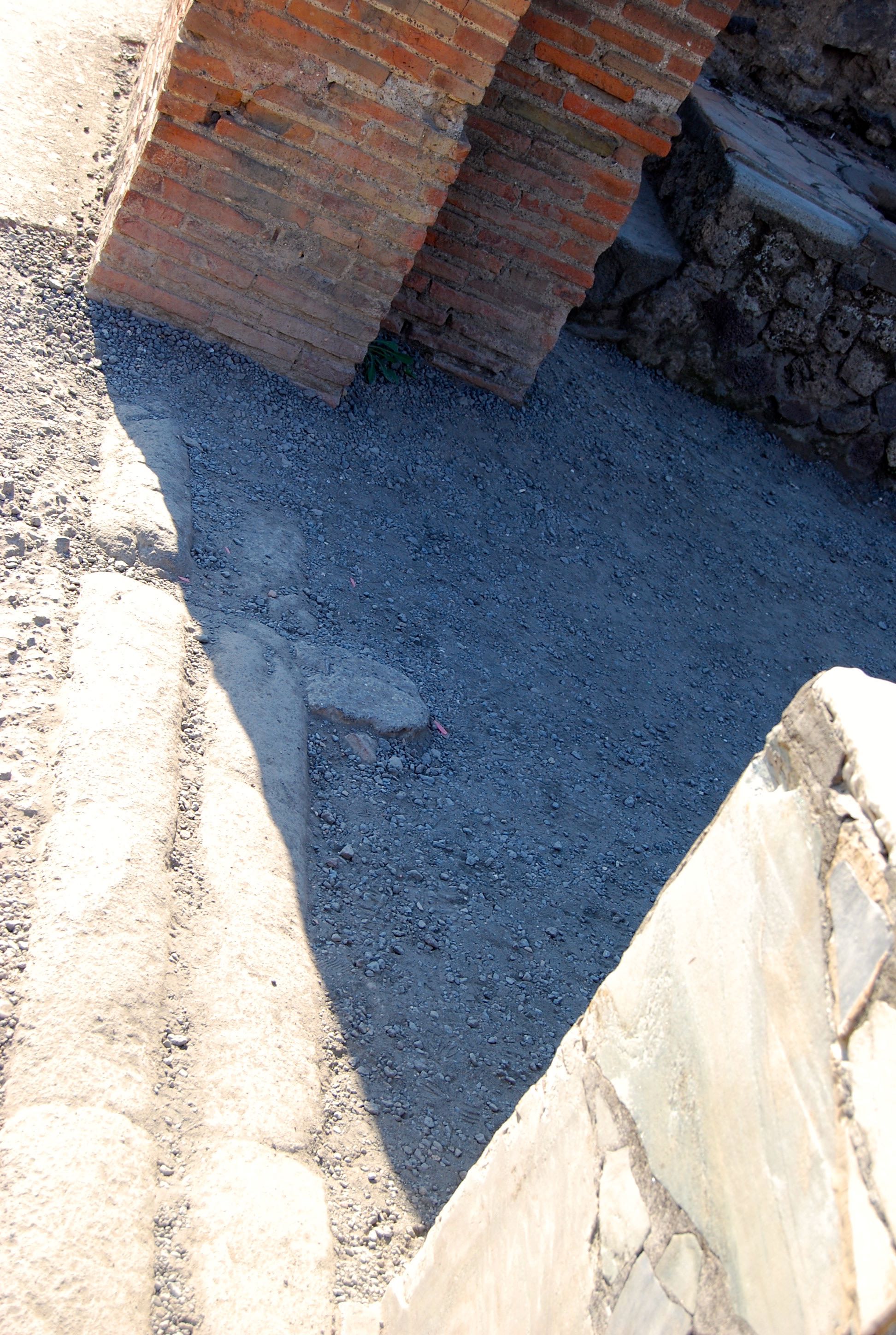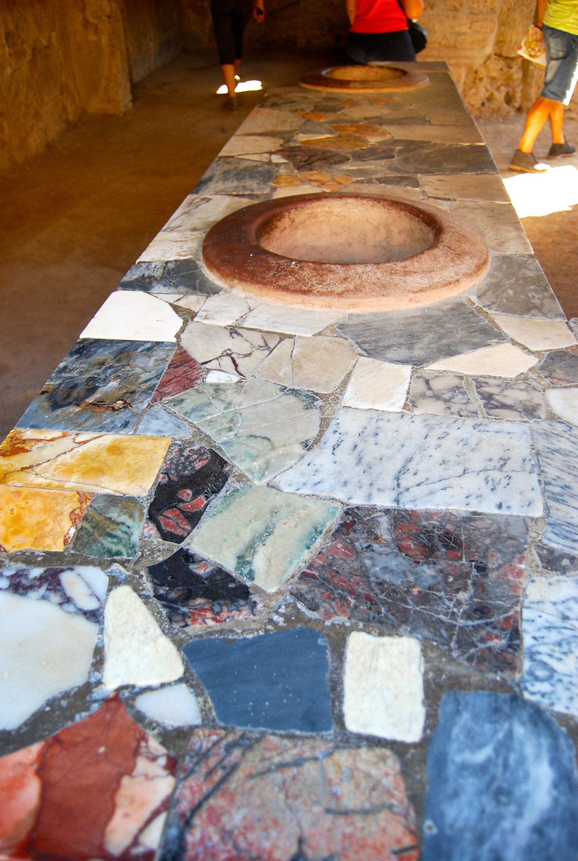 The basalt stones are the original Roman pavement. The sidewalks (elevated to hide the plumbing) were paved with bits of broken pots (an ancient form of recycling) and studded with reflective bits of white marble. These “cats’ eyes” helped people get around after dark, either by moonlight or with the help of lamps.