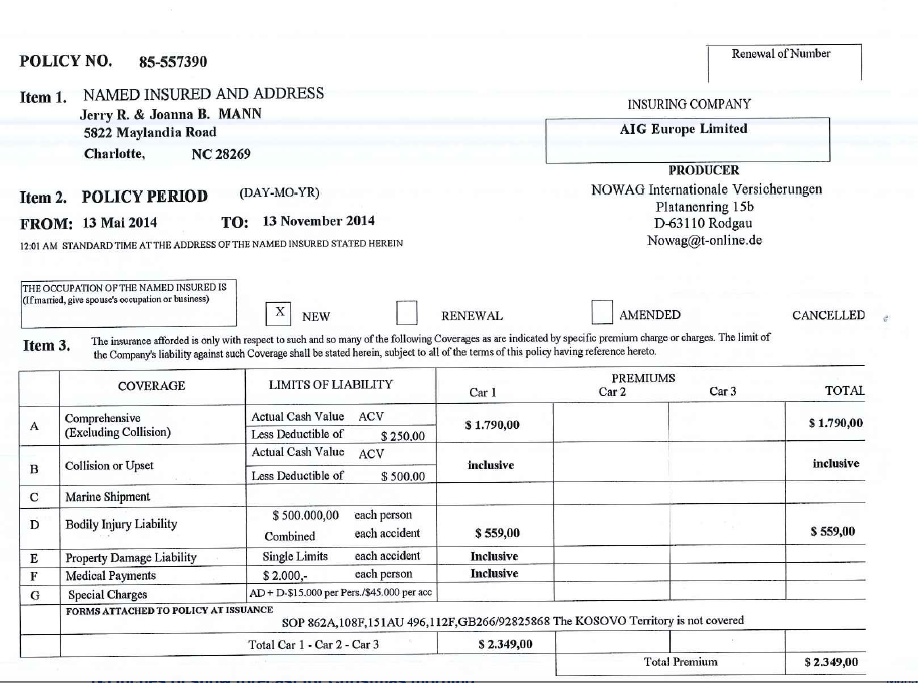 U.S. auto insurance is not valid in Europe; a separate policy must be purchased to coverage while driving there. After much research on the Internet (the type of policy we were looking for is not easy to find) I contacted Minnesota based Thum Insurance Agency, referenced in a book that I used to gather information “Take Your RV To Europe: The Low-Cost Route To Long-Term Touring” by Ron and Adelle Milavsky. This was fortunate as the only other quote I received from Hamburg based TourInsure was for double what I ended up paying, which was $2,286. This is roughly what I would have paid for similar coverage through Volvo if we’d purchased one there, also a bit more expensive given the value of the Highlander.