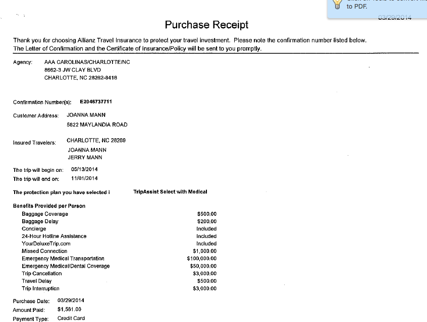 Total cost of the policy was $1,561 and included Lost Baggage, Baggage Delay, Missed Connection, Emergency Medical Transportation, Emergency Medical and Dental Coverage, Trip Cancellation, Travel Delay and Trip Interruption coverage. We wanted to make sure that if something serious were to occur, we’d have the option of being flown back to the States for treatment here.