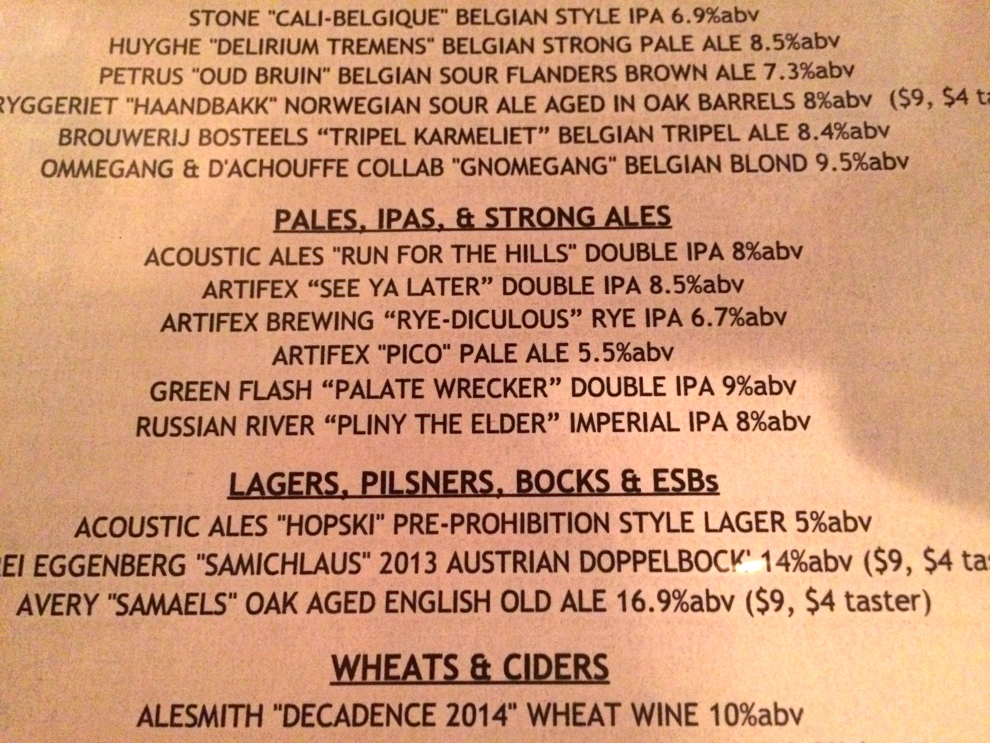 Joanna and had thought about eating there two nights earlier, but it was crowded and as it turned out, the Lotus Café experience had worked out so well. This time around, mid Sunday afternoon, the Ale House was busy in a nice way, and after sitting down and examining the beer list we were glad we came. Among their many offerings was the long sought after but rarely encountered Pliny the Elder. I found it interesting that the two places I’ve found this fine brew outside of its home city of Santa Rosa was here in San Diego County.