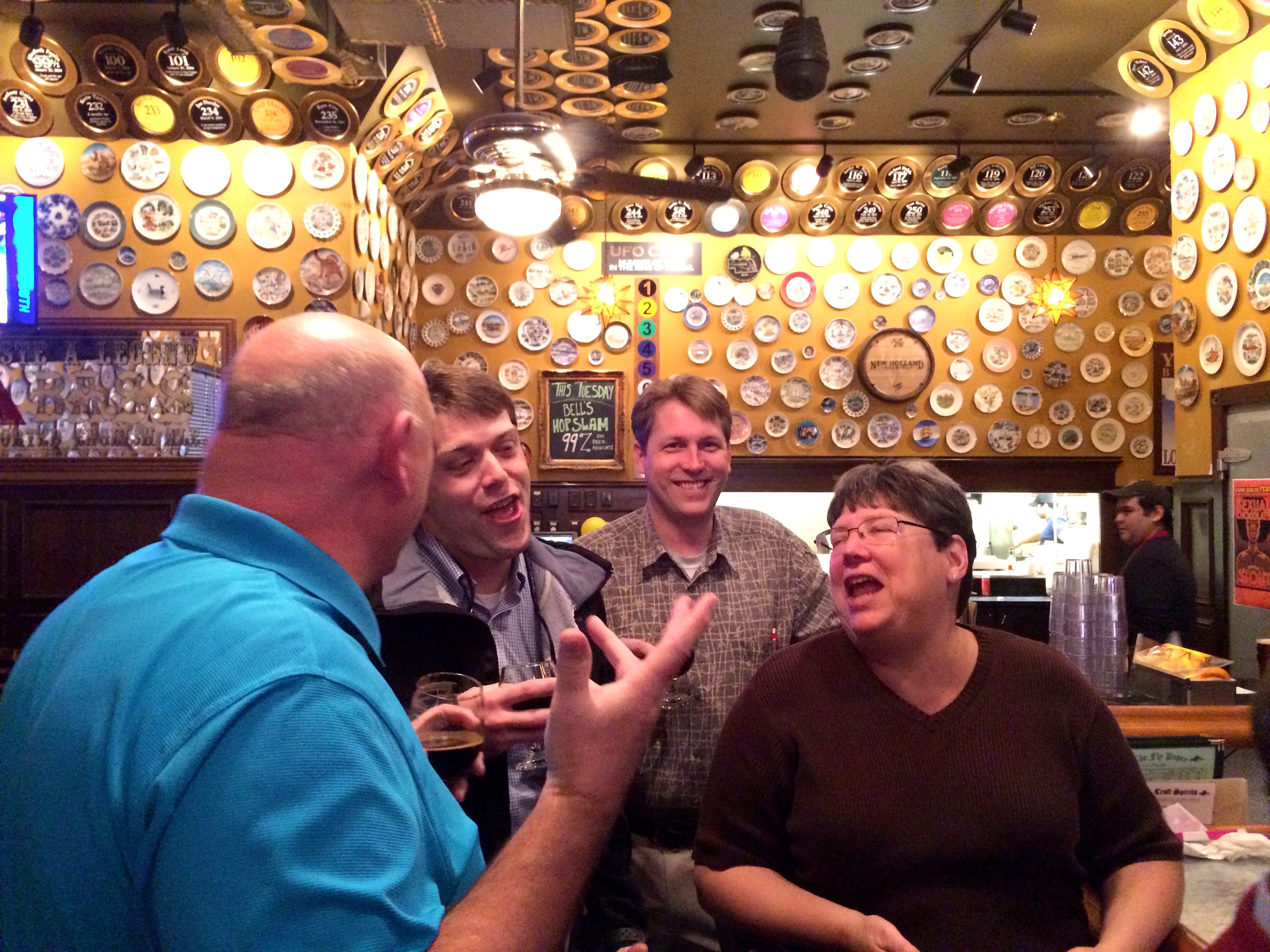 The next day I joined Jim Hoppa at the Flying Saucer for what would turn out to be an impromptu and unexpected reunion with a number of former colleagues from UNC Charlotte. The Saucer comes closest to being the bar I’m most closely associated with and one of the reasons is that each time I visit there is a good chance I’ll run into someone I know. This will diminish over time as my connection to campus lessens, but for now it’s proximity to school means there is a good chance I’ll continue to see folks I’m familiar with.