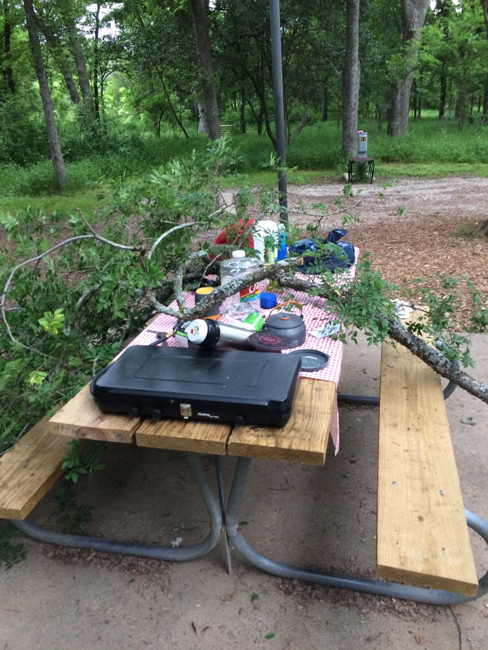 We finished up late and before driving back to the campground, made plans to meet with Roberta and Mark for dinner and more music the next day. That night a terrific windstorm blew through camp accompanied by loud crashing noises. Upon awaking the next morning we found the remains of a sizable tree limb spread across the campground table. Fortunately nothing was damaged but the incident did make us take a second look at some of the trees situated close to our tent, wondering if any of them looked a little less stable than the day before.