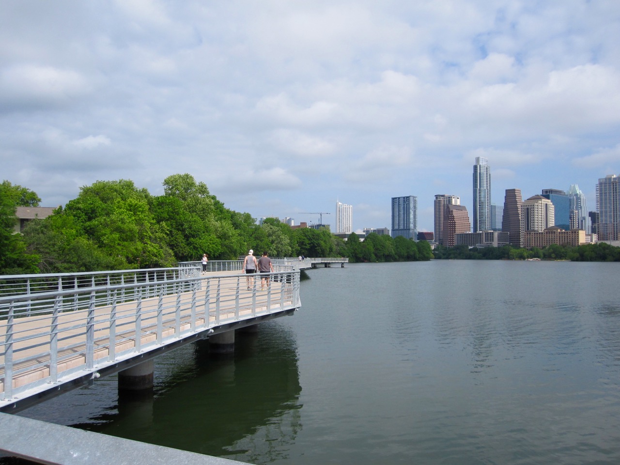 Bordered by the Ann and Roy Butler Hike-and-Bike Trail (one of the oldest urban Texas hike and bike paths), it is 10.1 miles long with a smooth, mostly crushed gravel surface augmented with a few lengths of concrete and a boardwalk. We rode some distance up the south bank, under Congress Avenue ending up at the docks of river tour companies that offer an evening on the lake with the opportunity to see the nightly migration of the bats that live under the Ann W. Richards Congress Avenue Bridge.