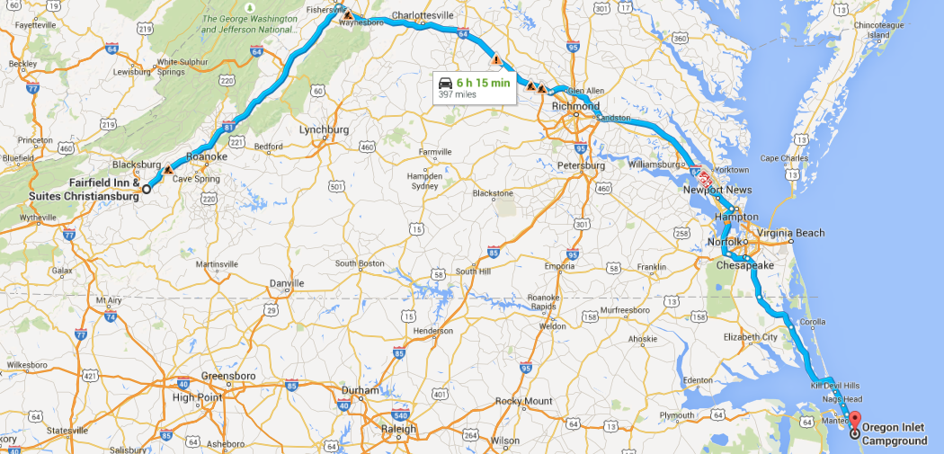 With a six hour drive in front of us on Wednesday we didn’t dawdle in the morning, packing by now an efficient routine for us, loading the car and then grabbing breakfast at the Fairfield before we hit the road. As we approached Norfolk the rain that had been predicted started to come down and would stay with us almost all of the way to Bodie Island, the northernmost of the islands that comprise the Outer Banks and home to our campground, Oregon Inlet Campground.