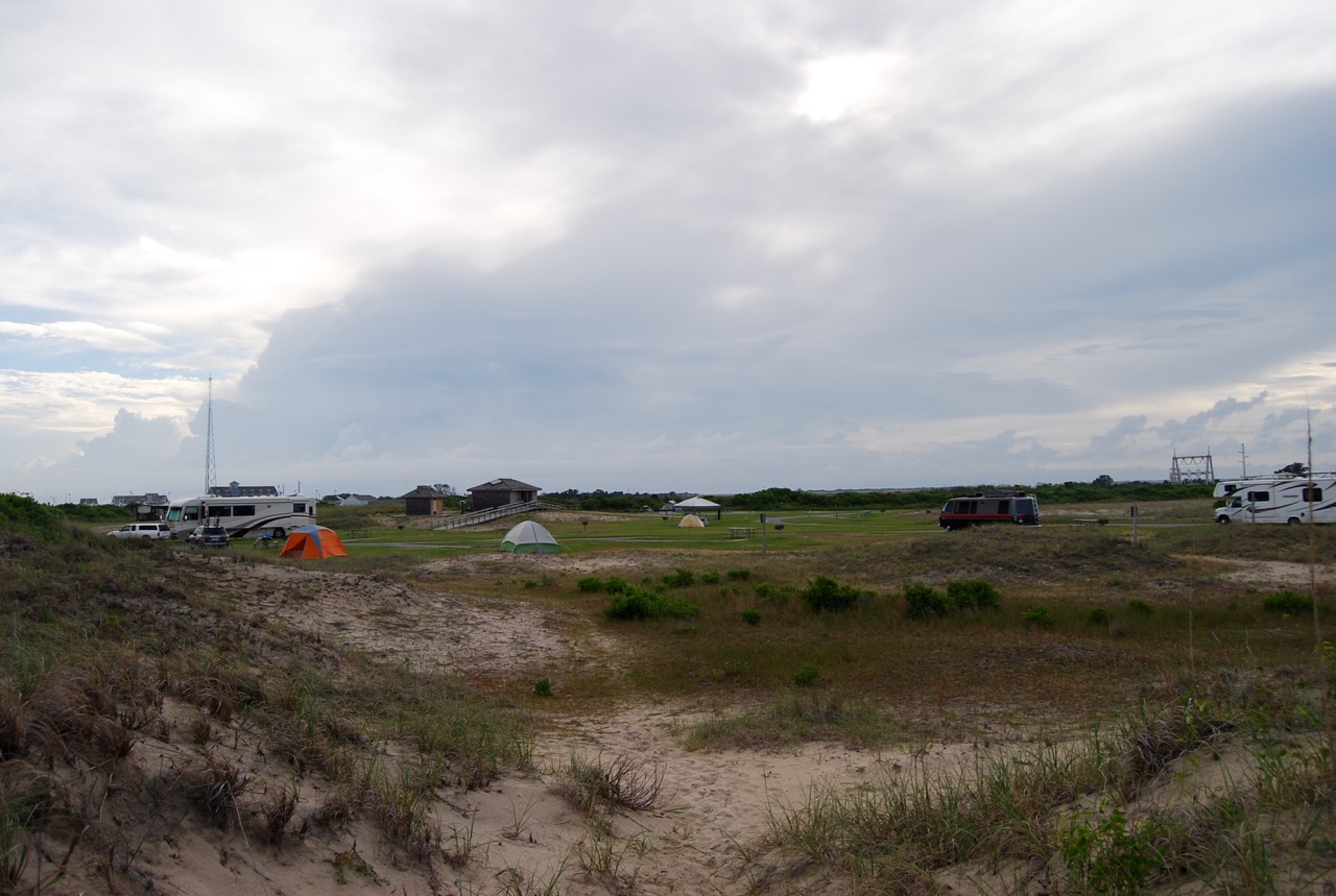 This is part of the Hatteras Island National Seashore, the nation’s first, established in 1937 to preserve segments of unspoiled barrier islands along North Carolina’s stretch of the Atlantic Coast. We arrived at camp after cruising south on the island through the communities of Kitty Hawk, Kill Devil Hills, and Nags Head. By now the rain had let up and the cool temperatures we’d encountered in Blacksburg were but a memory; we checked in at camp and found a spot to put the tent up, large sand dunes separating us from the ocean you could hear in the background.