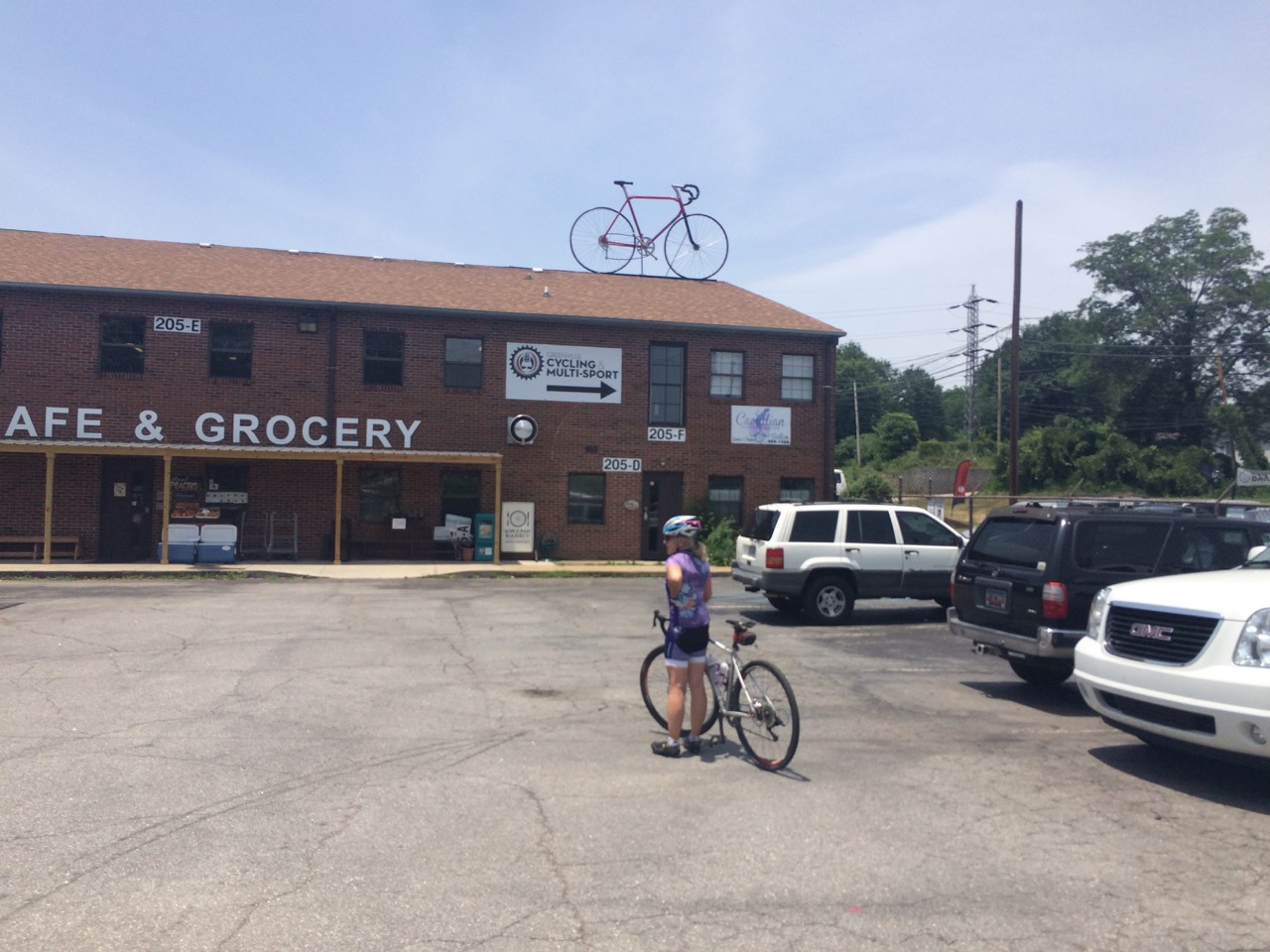We continued riding until we entered Travelers Rest, found the end of the path on the north end of town and then turned around for the return leg back to the car. As is our practice (as followers of this blog will attest), we stopped for a mid-ride snack at one of a number of cute looking establishments available for such consumption. Cool Mamas Ice Cream shares a building with the Café at Williams Hardware and once inside we ordered a good sized cup of ice cream to split, enjoying it while sitting on a back patio that fronted the trail.