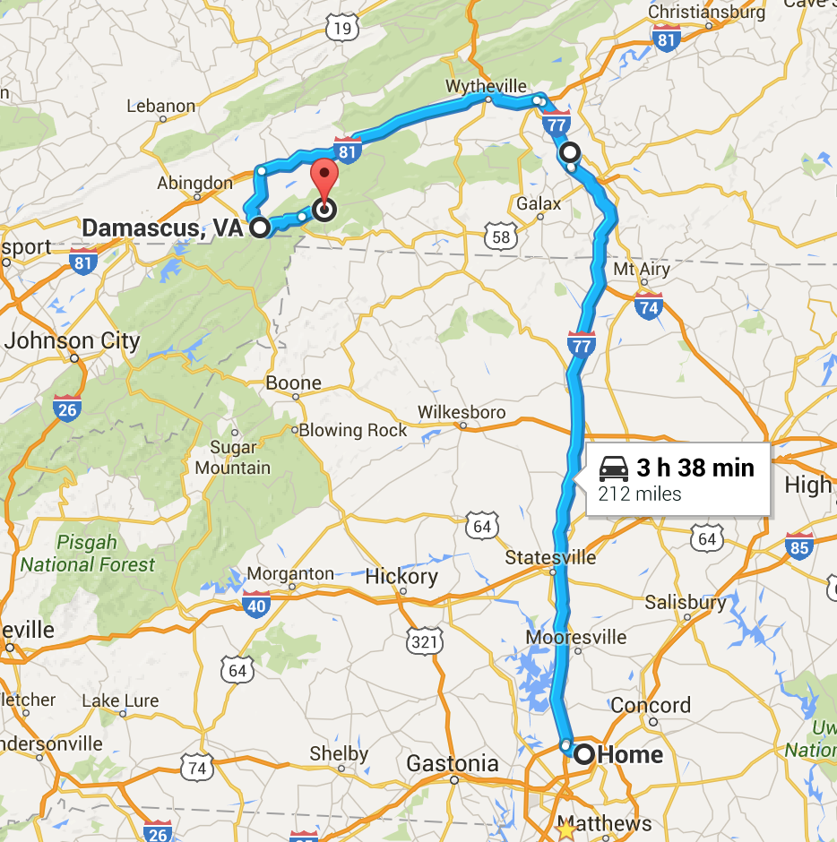 We rode the last six miles into Damascus, loaded up the bikes and made our way to Grindstone. Although not far in terms of distance, the middling stretch of the highway is posted at 25 miles per hour and they are serious about that speed limit. This is twisty, turning, sharp curves driving, beautiful scenery sliding past the windows as you keep your eyes on the road while trying to catch a glimpse every now and then.