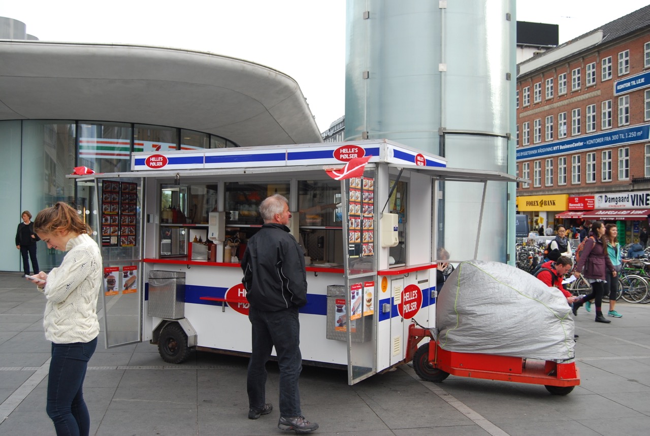 The train to town ran every twenty minutes and it would take us just about fifteen to get to our regular disembarkation spot, the Norreport station. Exiting at the square, filled with pedestrians and hundreds of parked bikes, we found Dillon and being hungry, grabbed a quick bite from one of the ubiquitous hot dog carts one finds throughout the city. Bev and Dillon both got hot dogs, loaded with all kinds of toppings while I got the Danish version of a burger, equally accessorized with condiments. At twenty-eight Danish Krone, this came to roughly $4.20, not outrageous but not inexpensive, a pattern we’d find throughout our stay in Copenhagen.