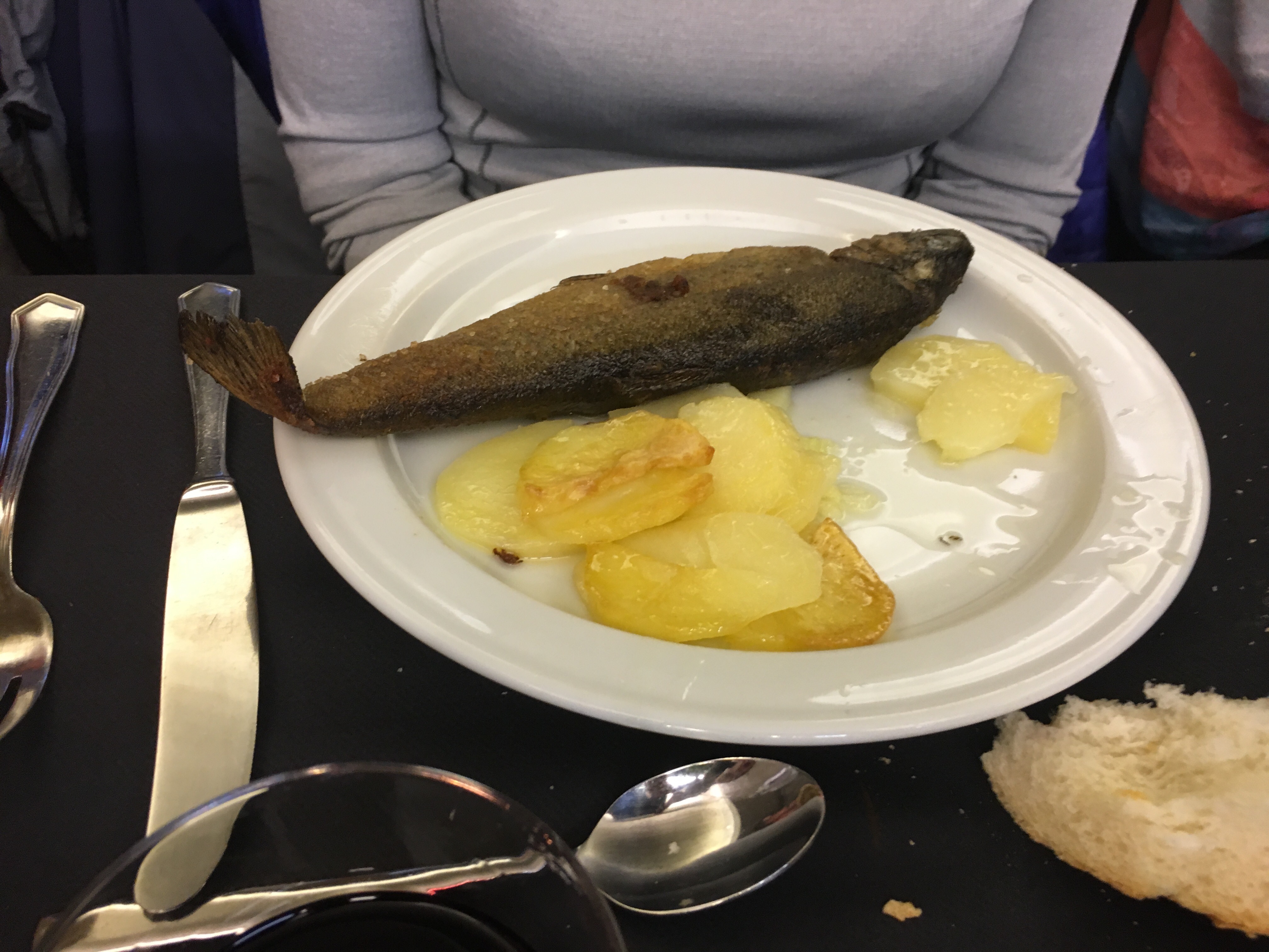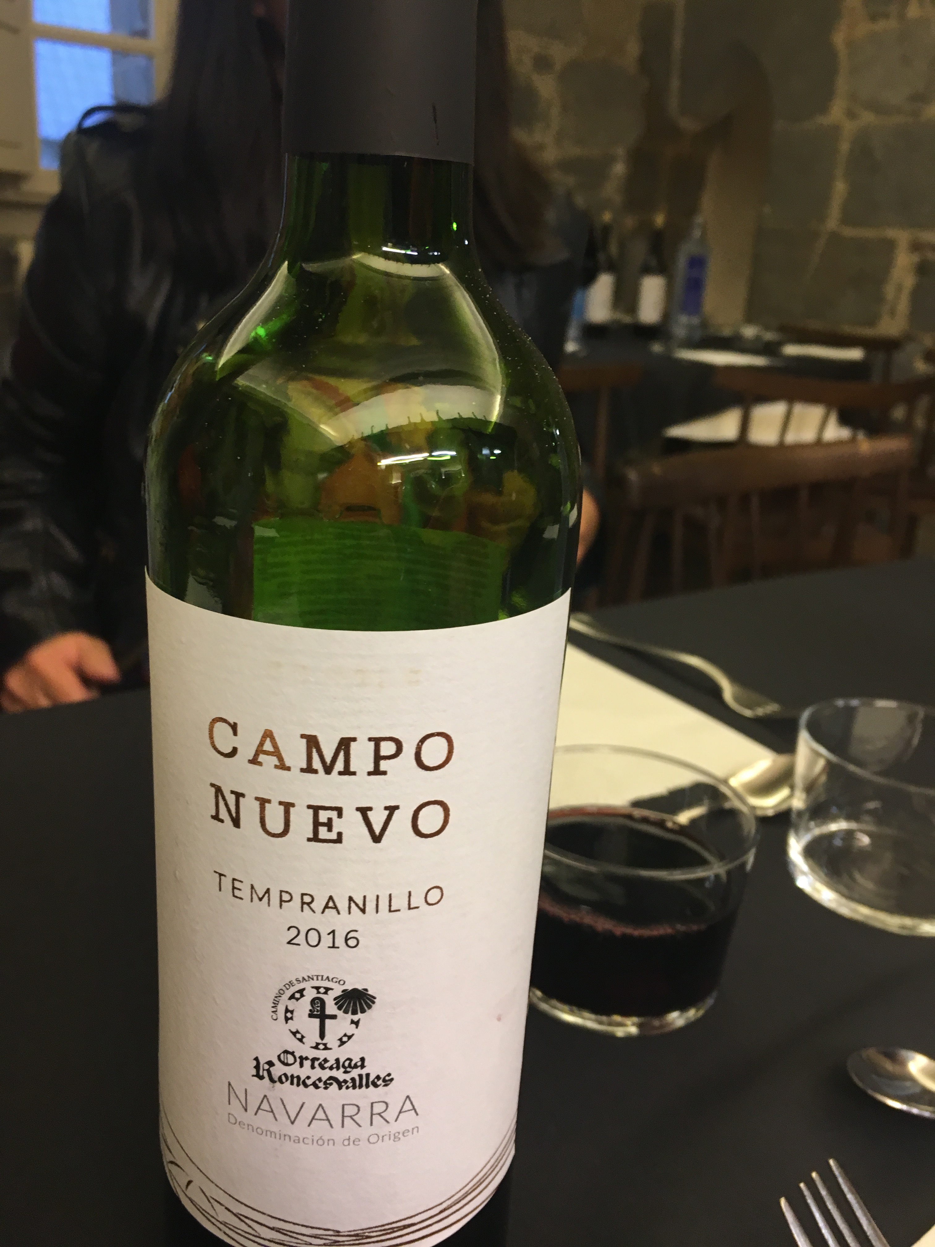 Our included dinner that night with about ten euro was next door at a restaurant; at the appointed hour we walked over and were seated upstairs at a table for 14 in a room with fellow pilgrims and offered our choices, soup or pasta to start, trout or pork as the entrée and a dessert. We were delighted to see a bottle of 2016 Tempranillo on the table for every four settings and would thoroughly enjoy that vintage. So far, this wine at dinner thing was working well for us.