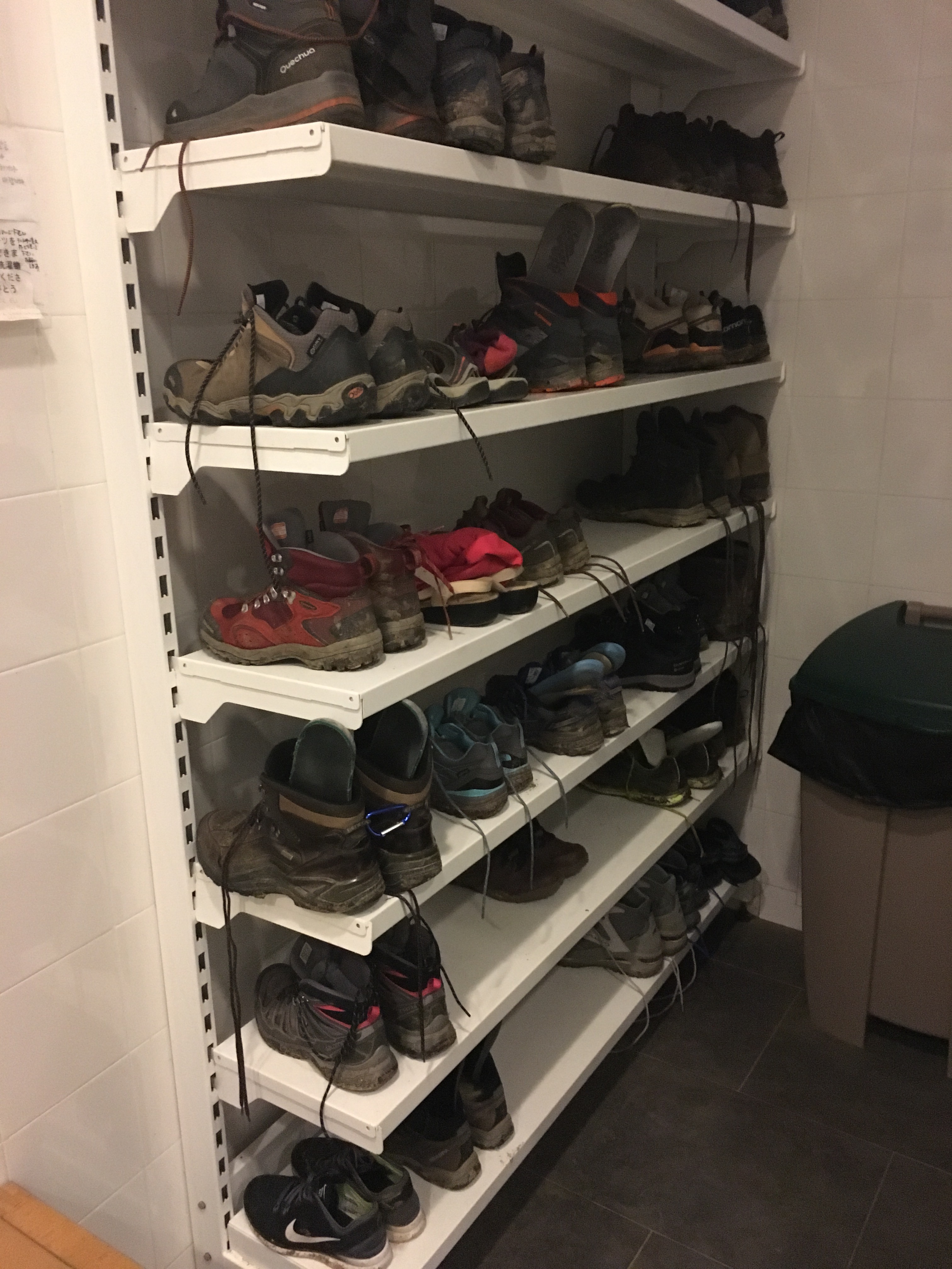 We slept OK that night, the snoring of one of our Australian female roommates hardly an annoyance and preparing us for future nights of sleeping in rooms with groups of other folks. We awoke to the alarm at 6am in pitch dark; it wouldn’t get light out until we started walking at 7:30. Our roomies kept sleeping while I went through an abbreviated 20 minute stretching routine and about the time I finished the room came alive as we all started preparations for the day ahead.