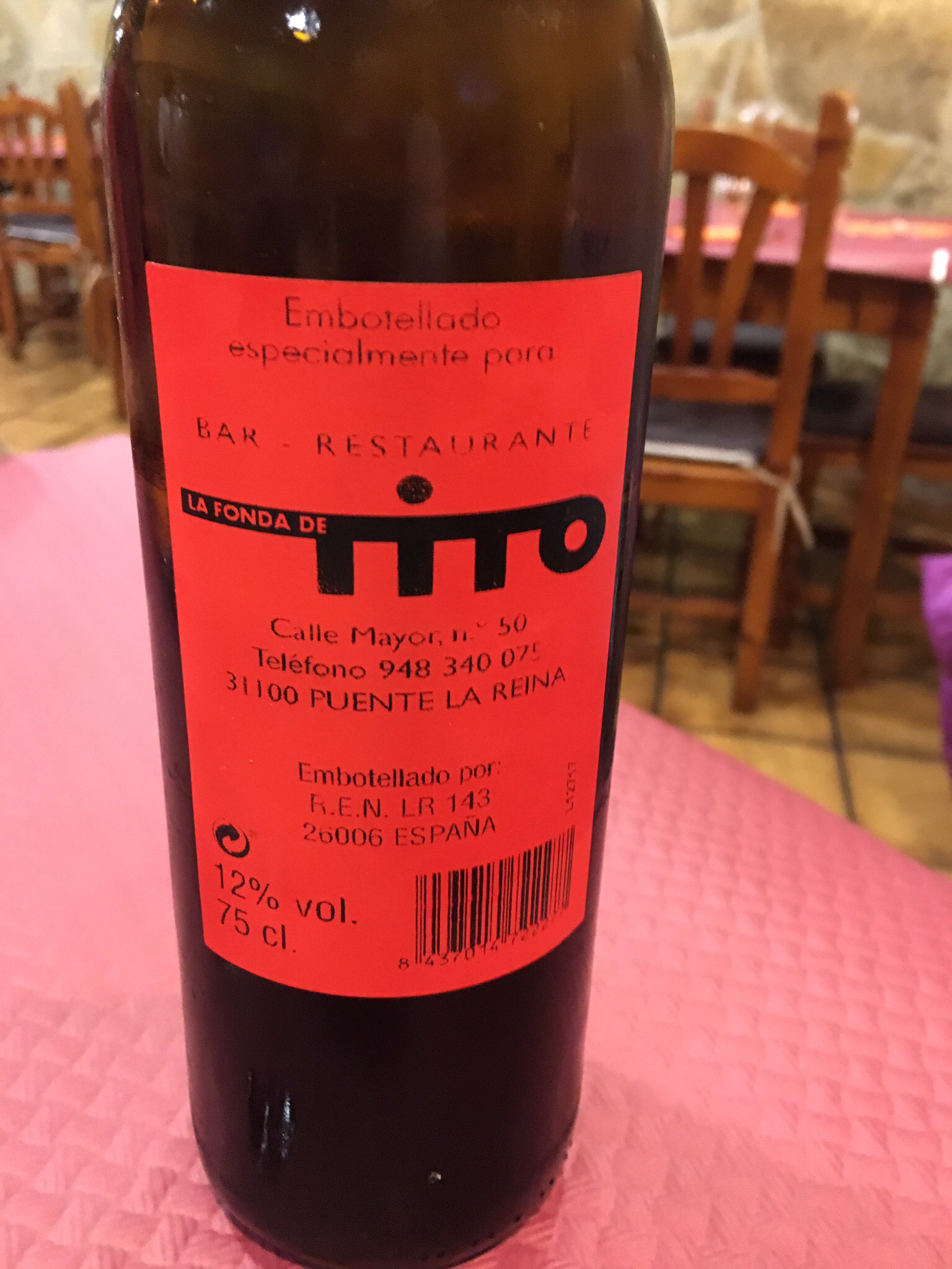 We’d walked a number of blocks down the narrow Main Street, bordered on each side by two story residences and after looking at menus, decided to eat at La Ronda de Tito due to its fetching looking pilgrim menu, only ten euros including wine. Just a couple of tables were occupied when we arrived, but the place soon filled up and we’d later understand why, receiving a large amount of food and that ubiquitous bottle of red wine.
