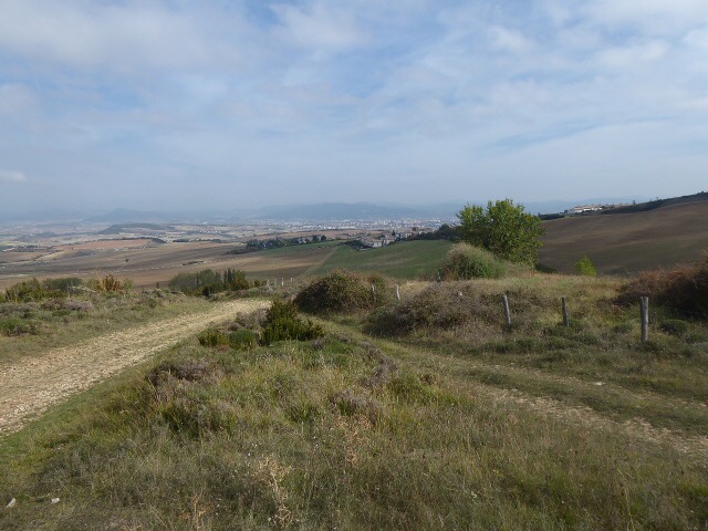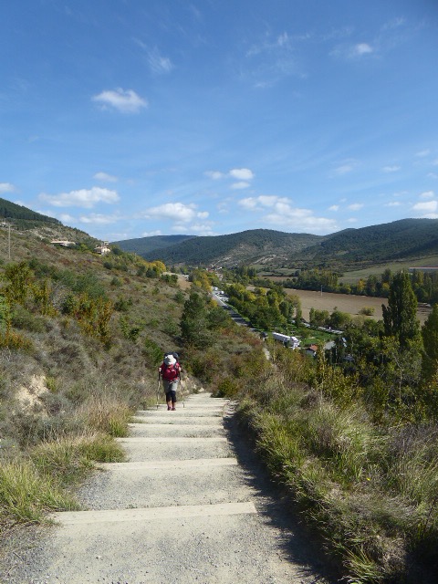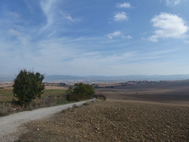 It was another brilliant day for weather, clear blue skies and moderate temperatures, cool to start and warming up by mid morning. We were looking forward to this day as it would take us to Pamplona, a town we enjoyed in 2014 when we camped at Escaba, just outside of town on the same road we’d be hiking near as we approached our goal. We made good time to start and our bodies felt good as we hiked through a pleasant combination of paved roads and dirt lanes and paths.