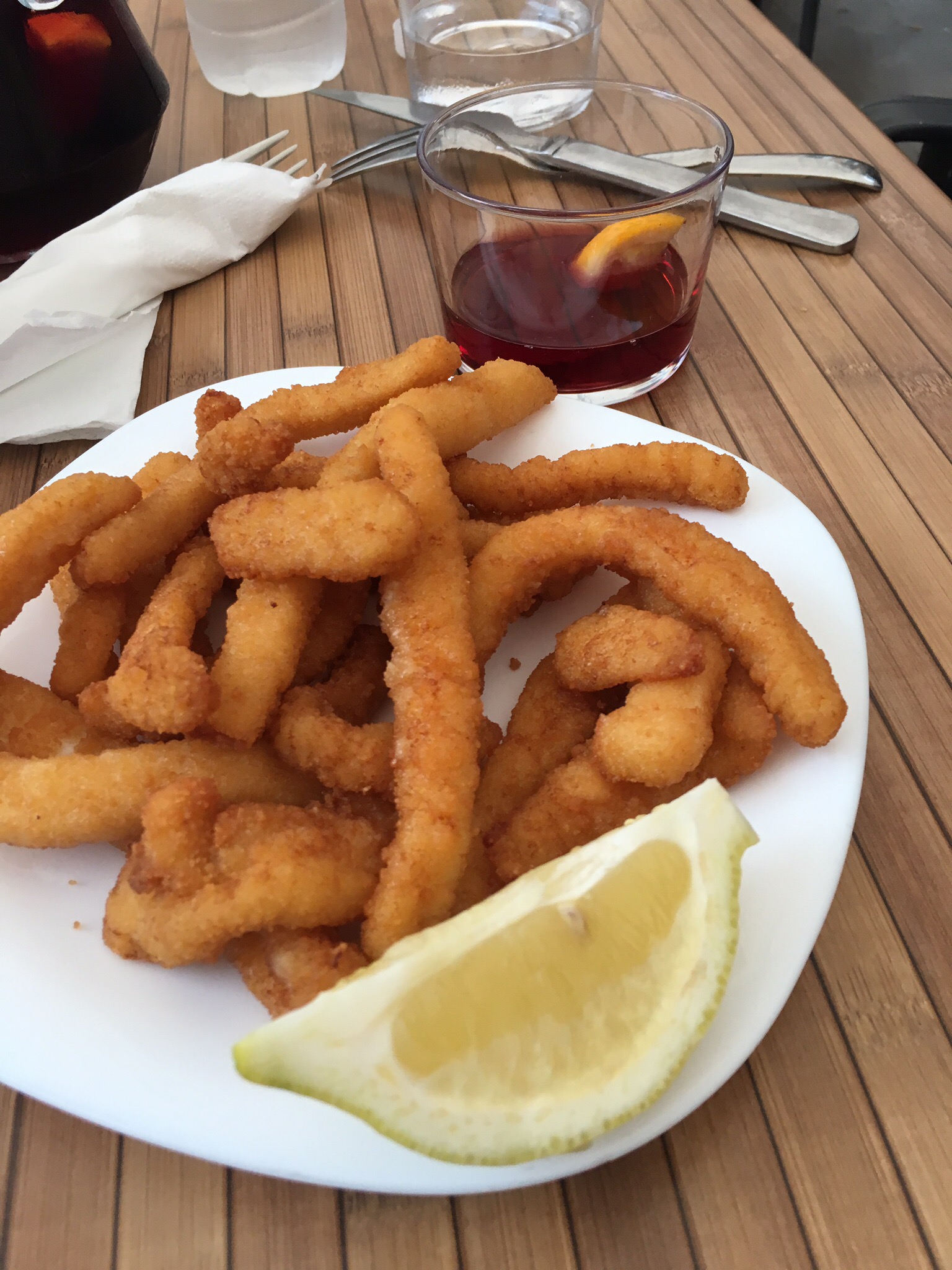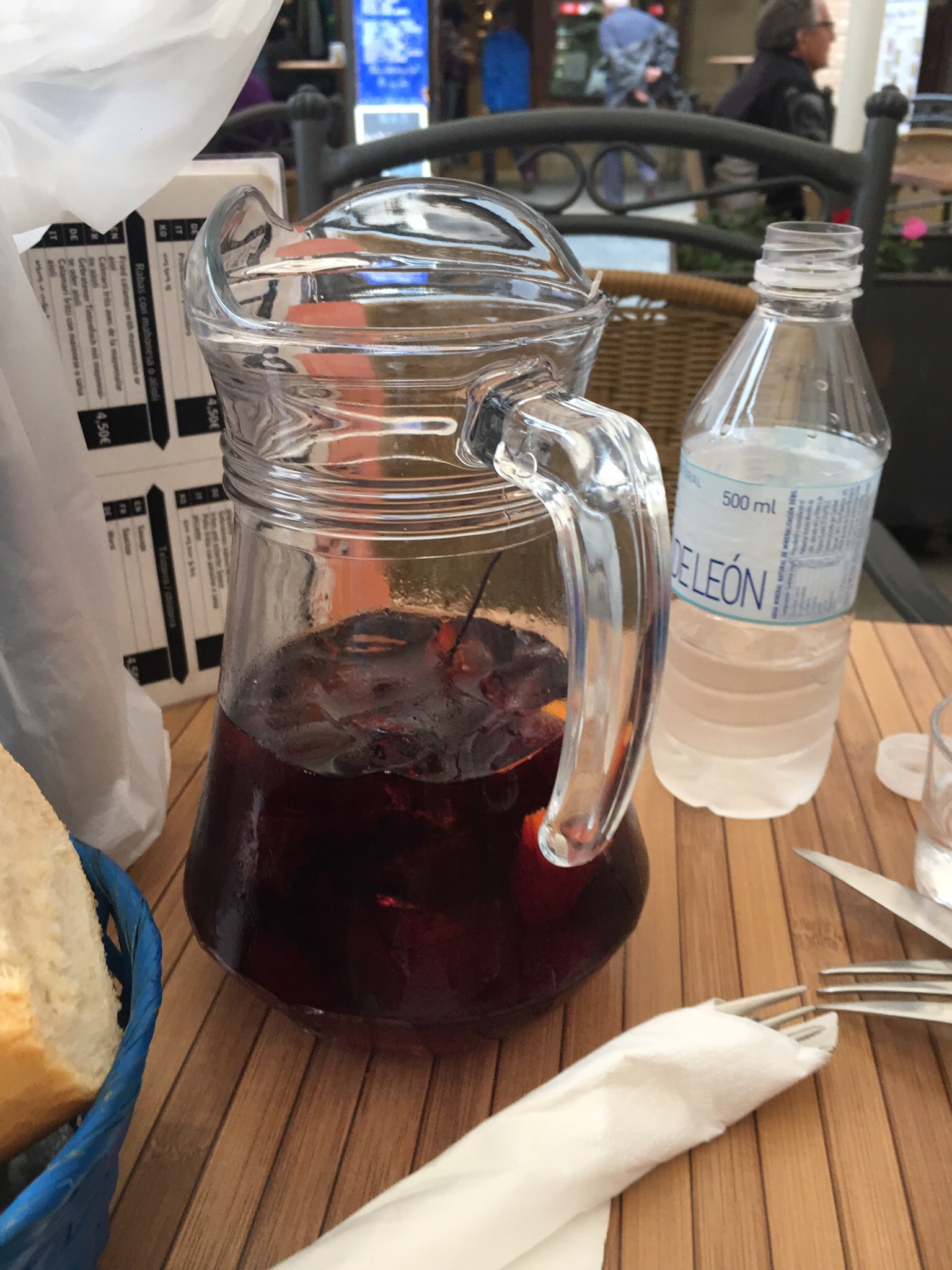 The calamari was the highlight, a nice sized portion, lightly breaded, moist and tender squid that melted in your mouth when you followed each bit with a sip of the Sangria. We finished and paid the tab, 22 euros, right around $25 for simple but very good meal.