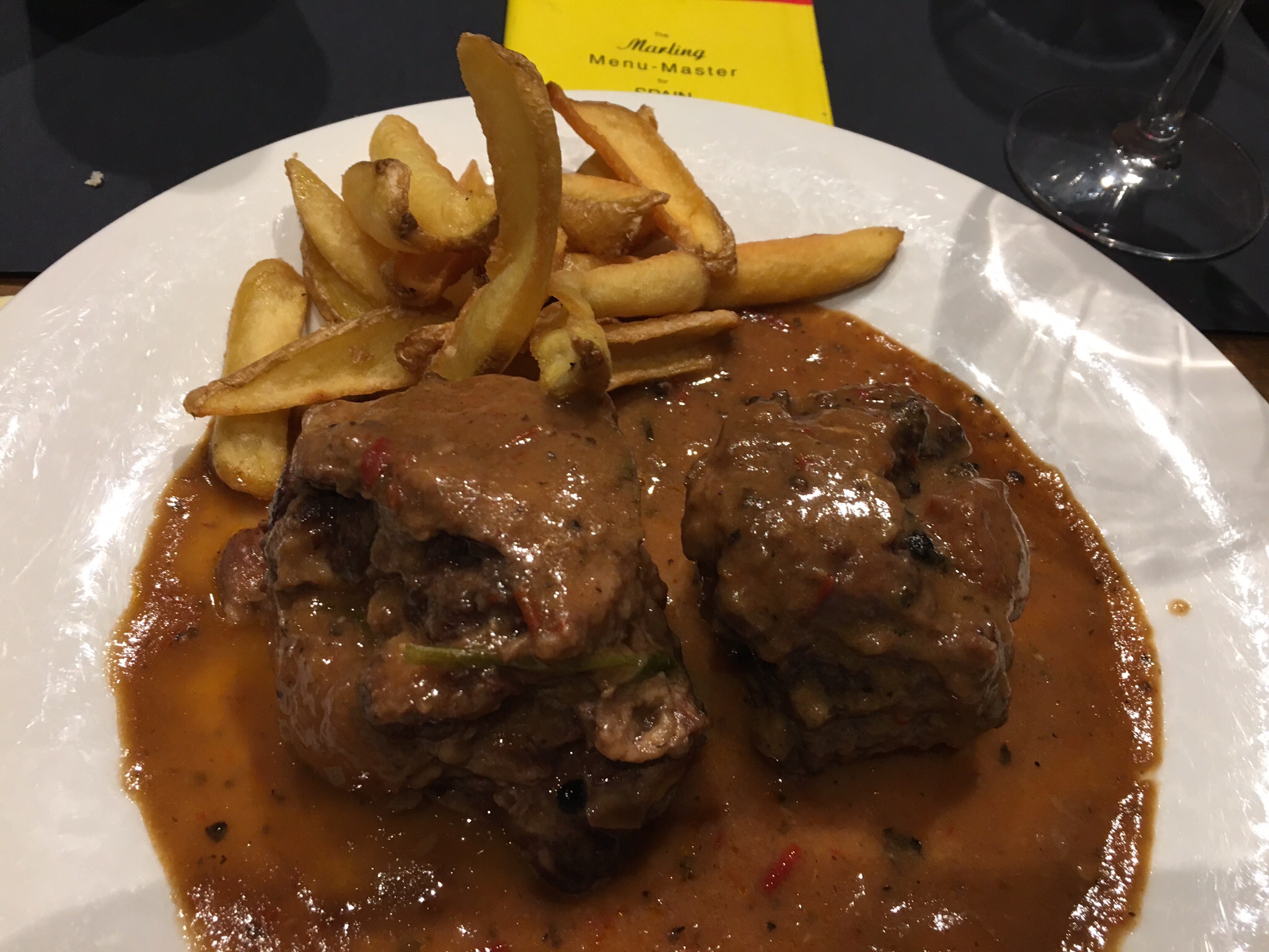 This was a good meal, nicely prepared and tasty and yet at 14 euros, we were expecting a bit better. Also, instead of one bottle of wine for two people we had to split it among four. Joanna had asparagus and I the carbonara for our first, she the sea bass and I the beef tail for our second. As we would soon lose contact with the girls, it was nice to spend some quality time with them at the dinner table. Just another one of those Camino moments, friendships quickly made and dissolved.