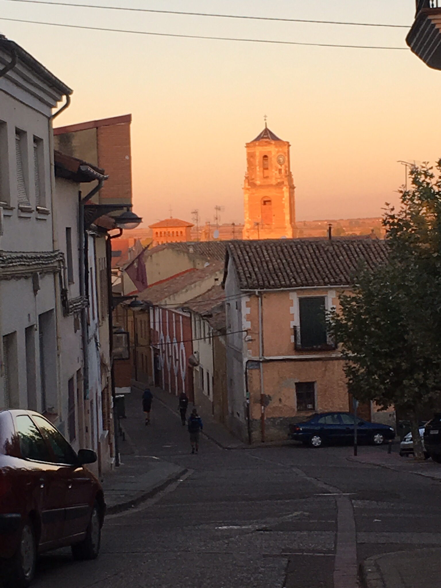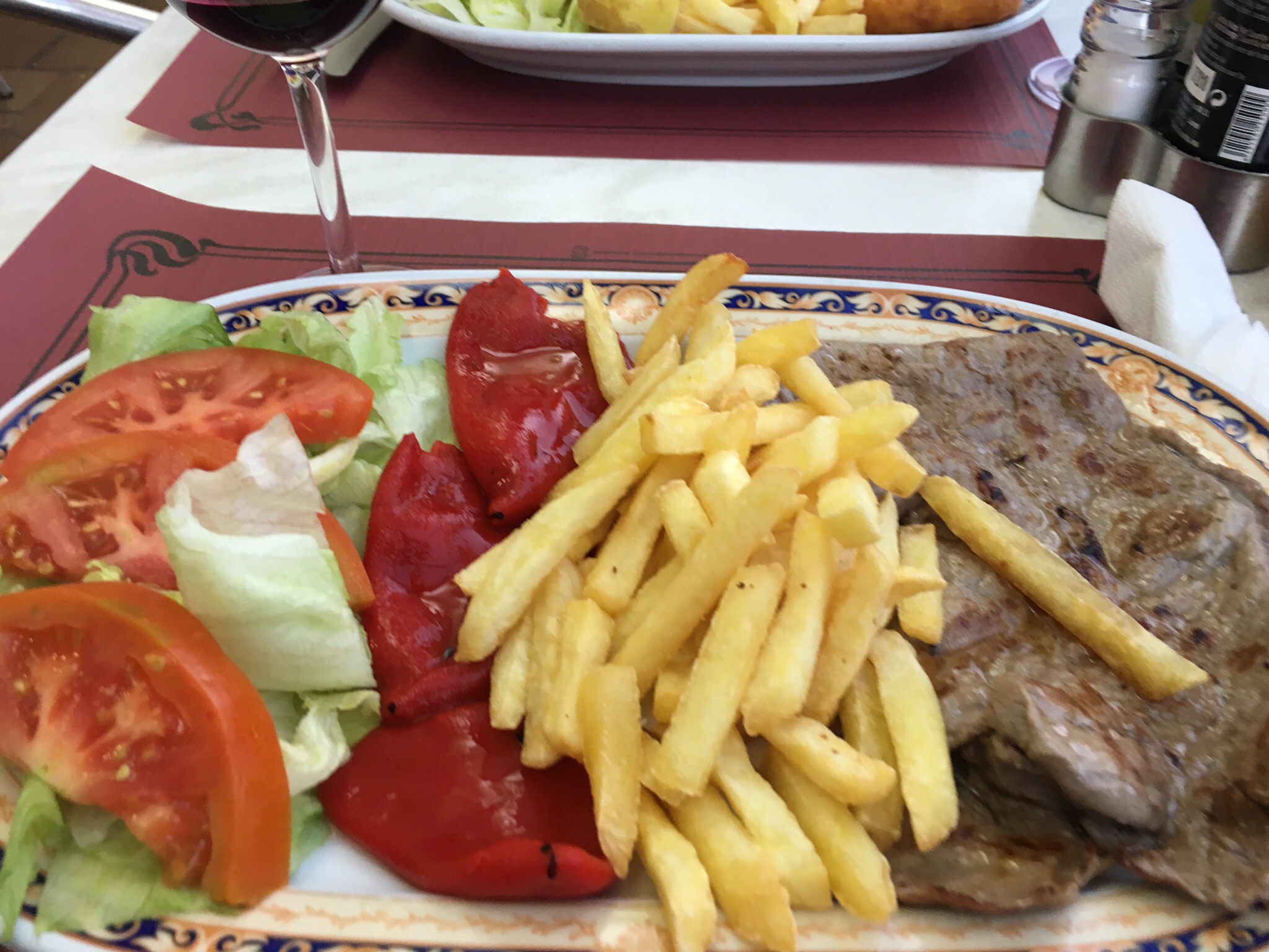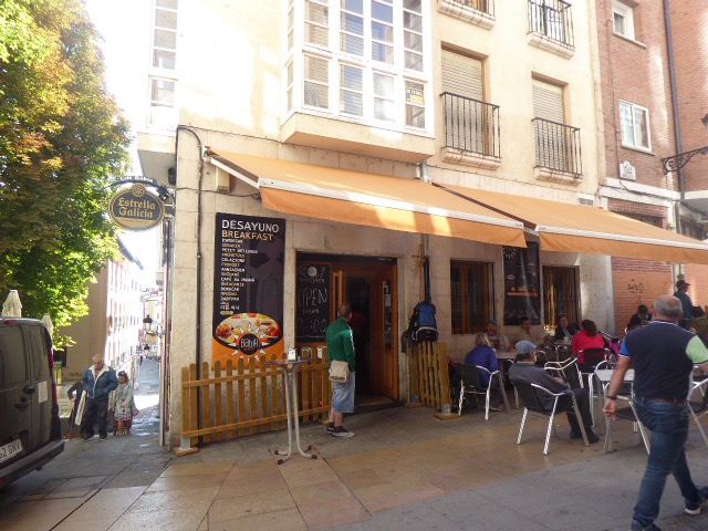 Satisfied with our setup, we bade Oscar a Buen Camino and rode back to the albergue, locking the bikes on the first floor and repairing to our beds to relax a bit before venturing out for food. Later, as we went on our search, we ran into Sally and Elliot, the two ladies from Portland who we’d been shadowing for a week or more. We all decided to go to the same place for a pilgrim meal at 14 euros apiece, Las Espuelas del Cid which had a nice looking menu.