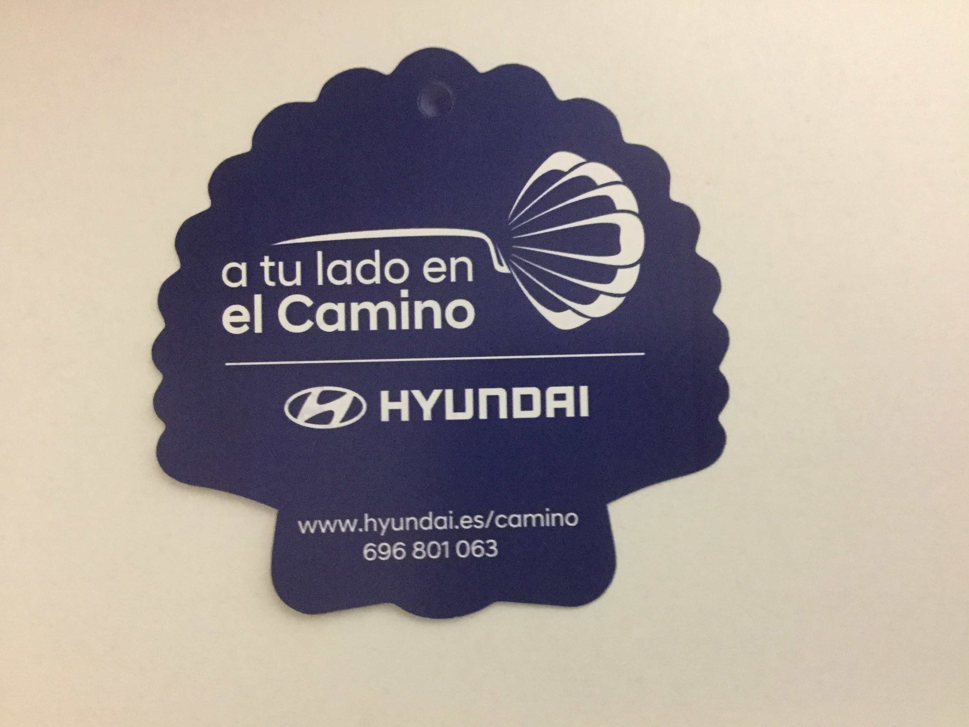 As mentioned earlier there were many pilgrims starting out that day, so many that the Hyundai Corporation had representatives at the outskirts of town handing out blue plastic business cards shaped like the Camino shell with contact information on it as we were informed we could contact them at any time for assistance.