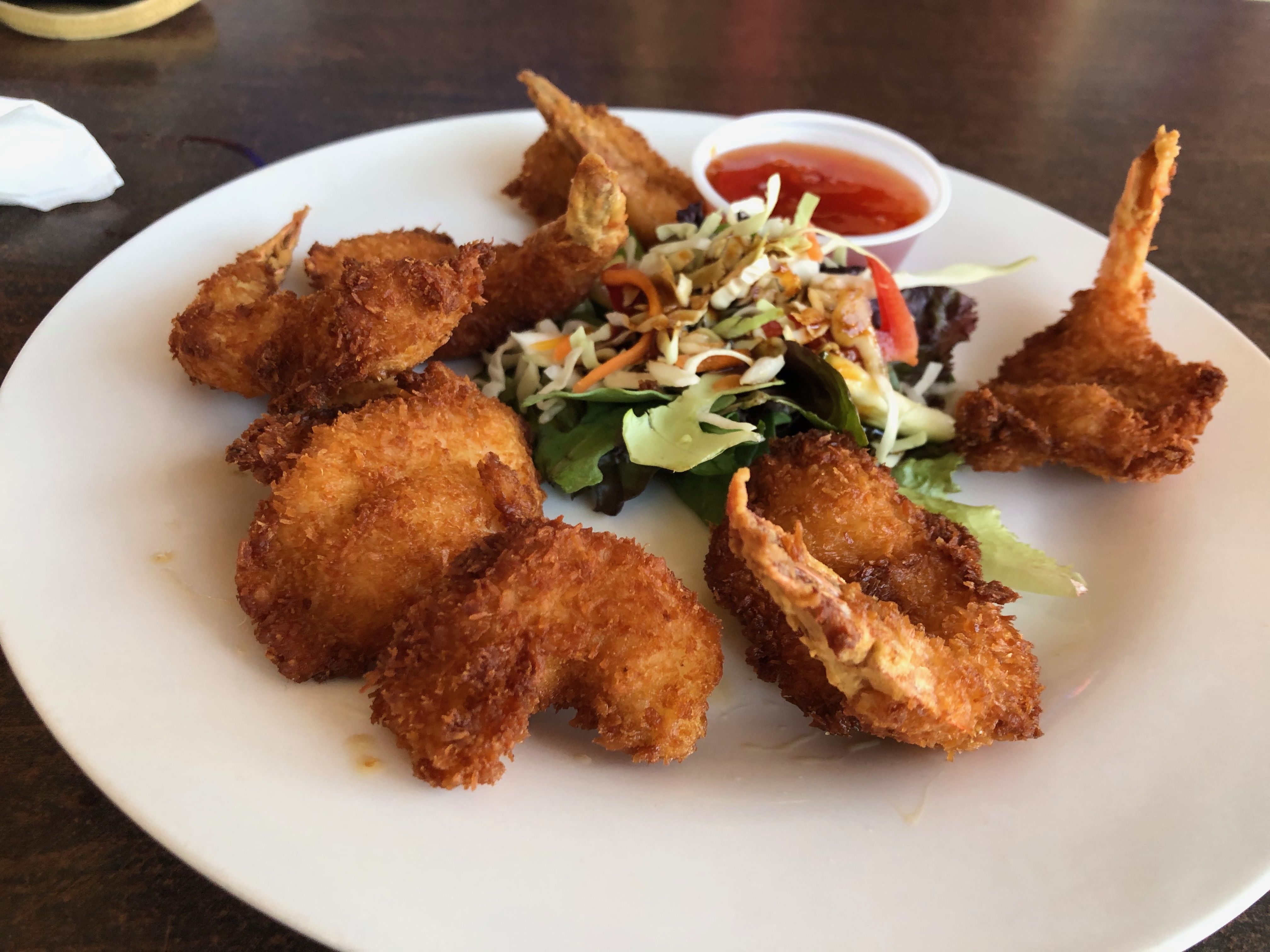 Our food came and the size and quality of the shrimp (Eight tiger prawns dipped in tempura batter and shredded coconut, fried golden brown and served on a bed of mixed greens with citrus chili dipping sauce) was impressive, all around a good choice for us that day. We paid our tab, a cheap $30, and walked back to the condo, remarking on what a friendly and convivial joint PJ’s was, and how if we lived nearby, we’d likely be regulars there.