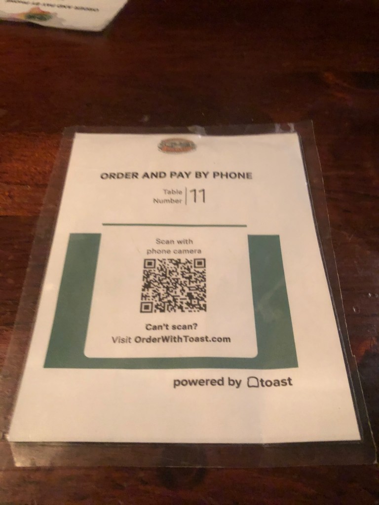 Two other safety features were in the use, the first a QR code that pulls up a menu and sometimes is also connected to an app where one can order and pay. This way the only time you encounter a server is when they bring you your food or drink.