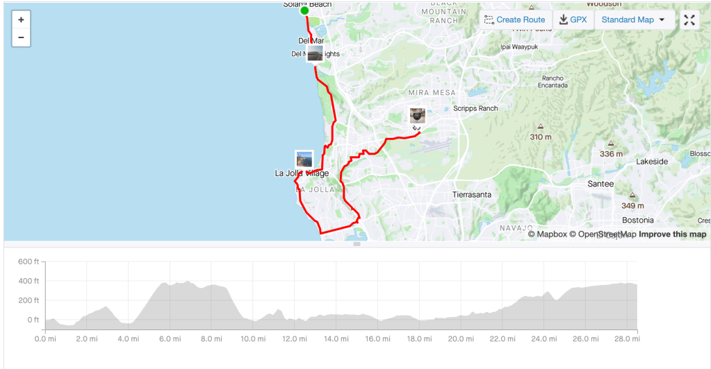 This one takes us south down PCH, up Torrey Pines Grade, down through La Jolla, east across Garnet Ave in Pacific Beach and then back up Santa Fe Street to the Rose Canyon Bike Trail.