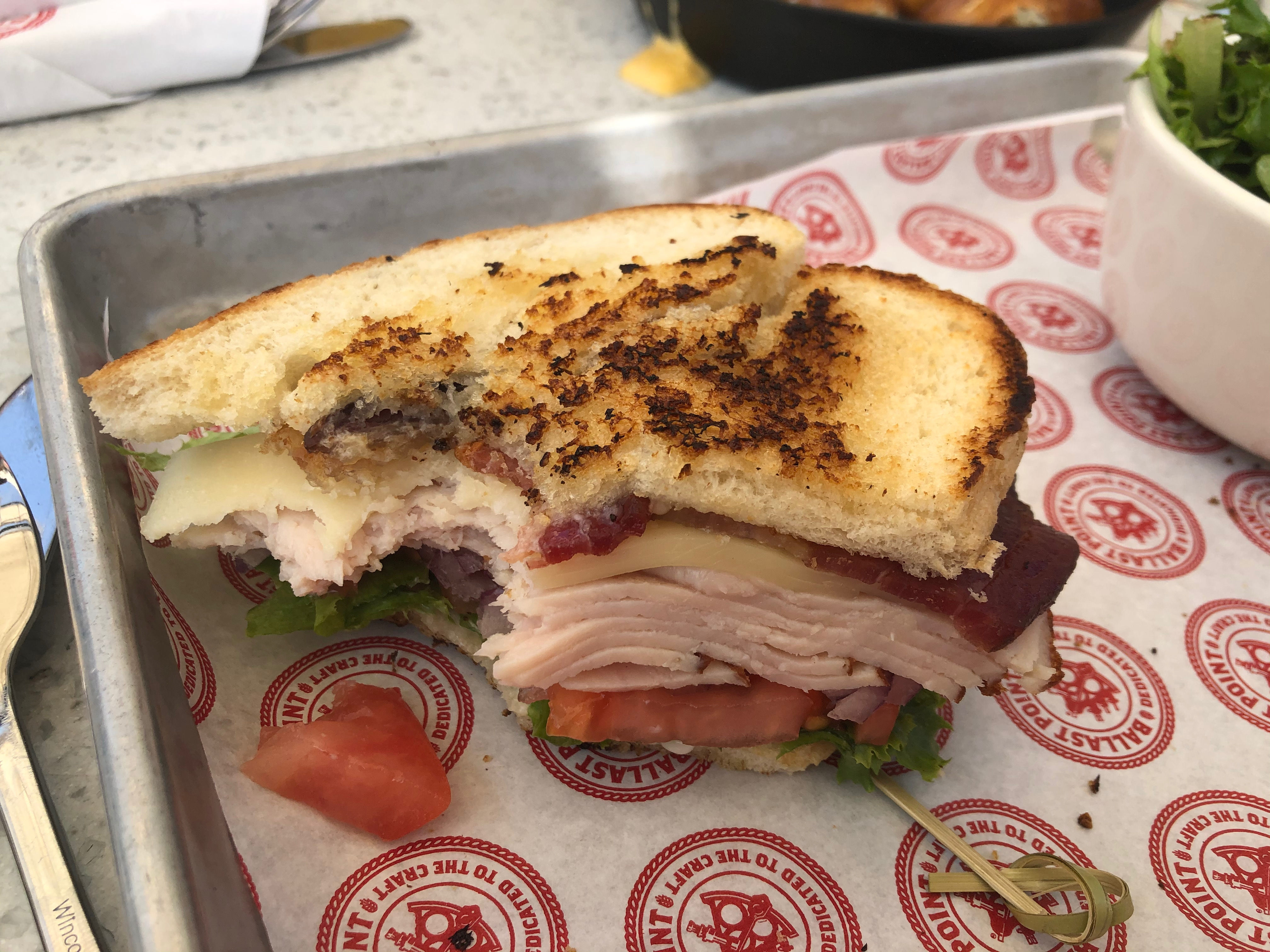 and its tip of the hat to the classic beers of Munich. Joanna and I split the Ballast Point Turkey Club Sandwich (Sliced turkey breast, bacon, Swiss cheese, lettuce, tomato, onion, garlic aioli, on toasted sour dough bread).