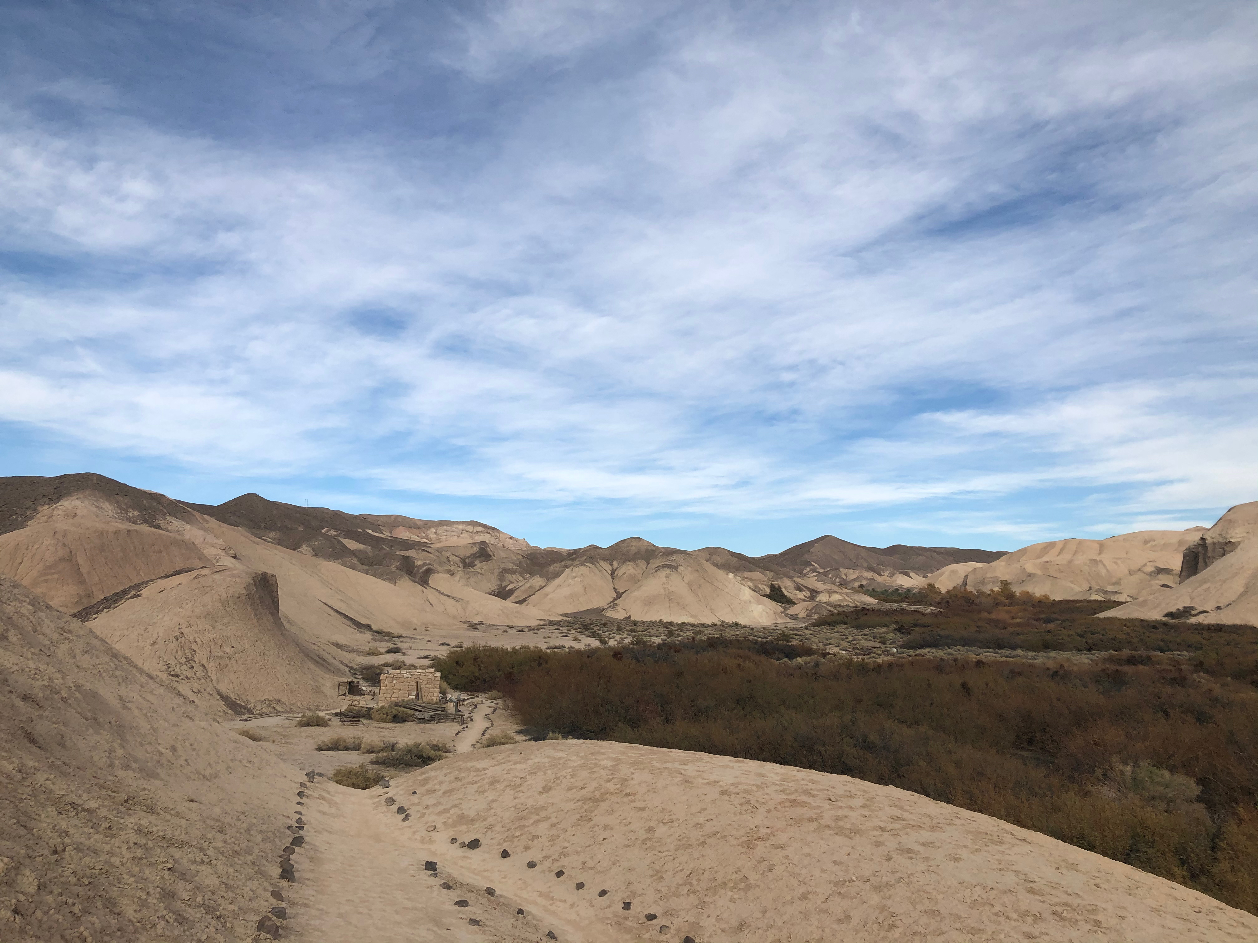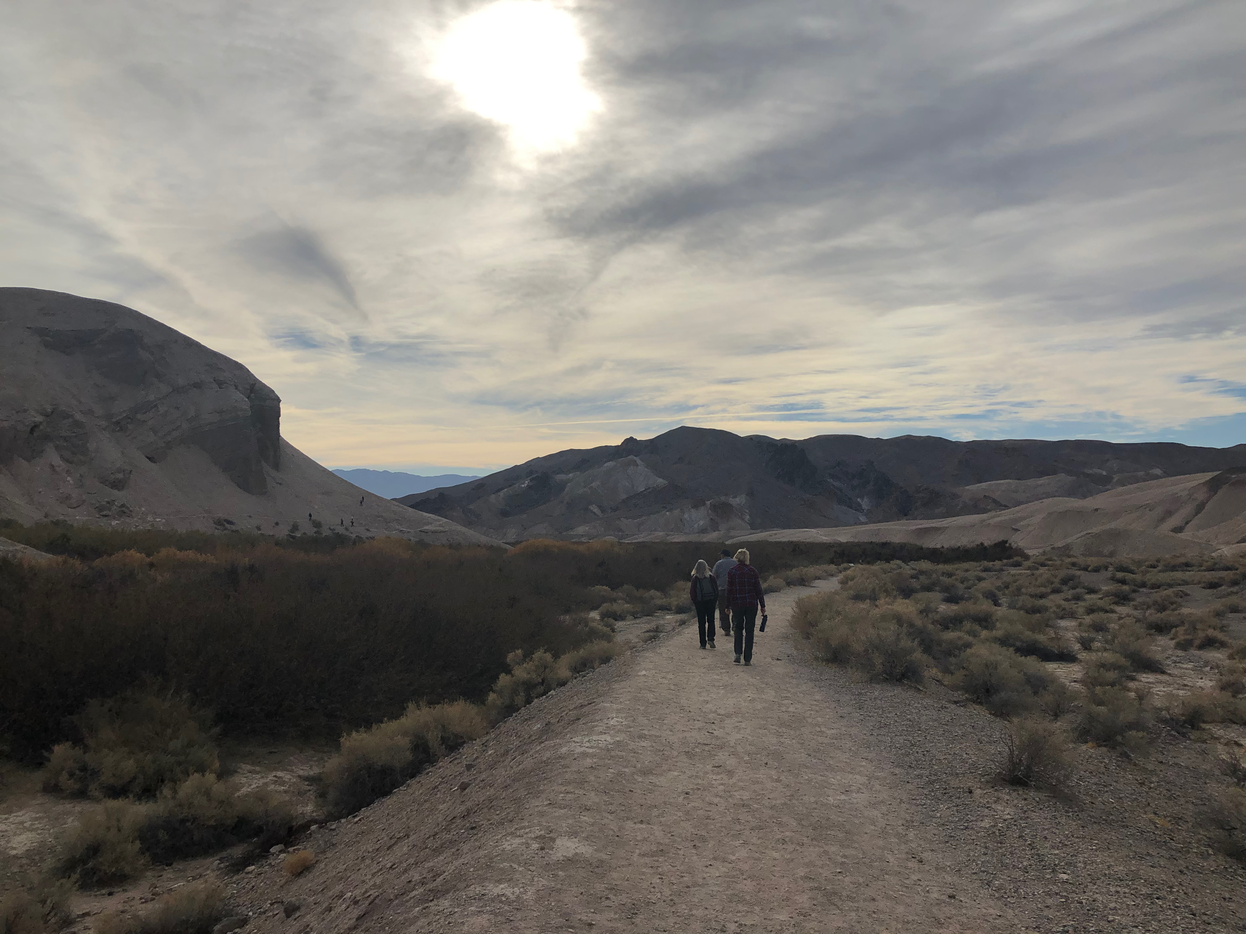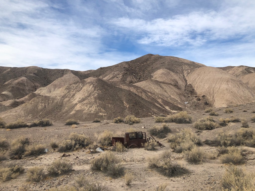 We parked the car in the dirt lot outside of the gift shop and hiking poles in hand, hit the trail for what would turn out to be an easy four-mile hike through various types of landscape. The first part of the walk took us past a couple of abandoned vehicles and an old miner’s shack and after some time we ascended a small rise to a signpost for a split in the trail that afforded us a nice view up and down the valley.