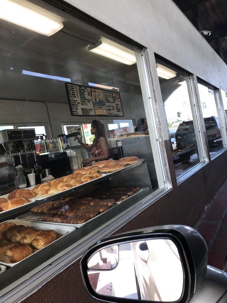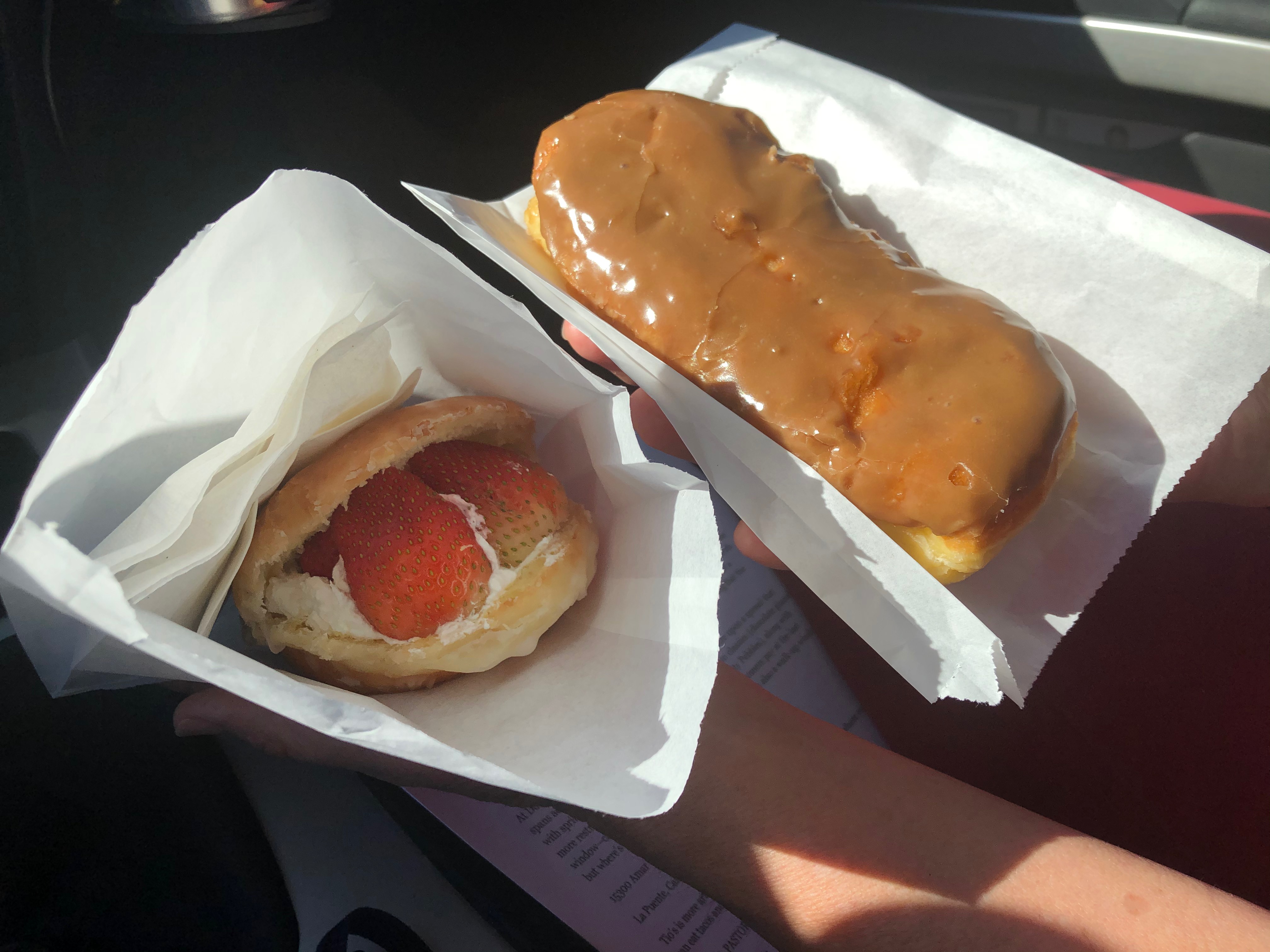 We got a couple of donuts and parked behind the structure, rapidly consuming the goodies and washing them down with coffee (with Kahlua, our favorite driving beverage) we’d brought from home. These were really good, although the cream filled strawberry product was challenging to eat. Fortuitously, we used our homemade in car dining kits to limit damage to the interior.