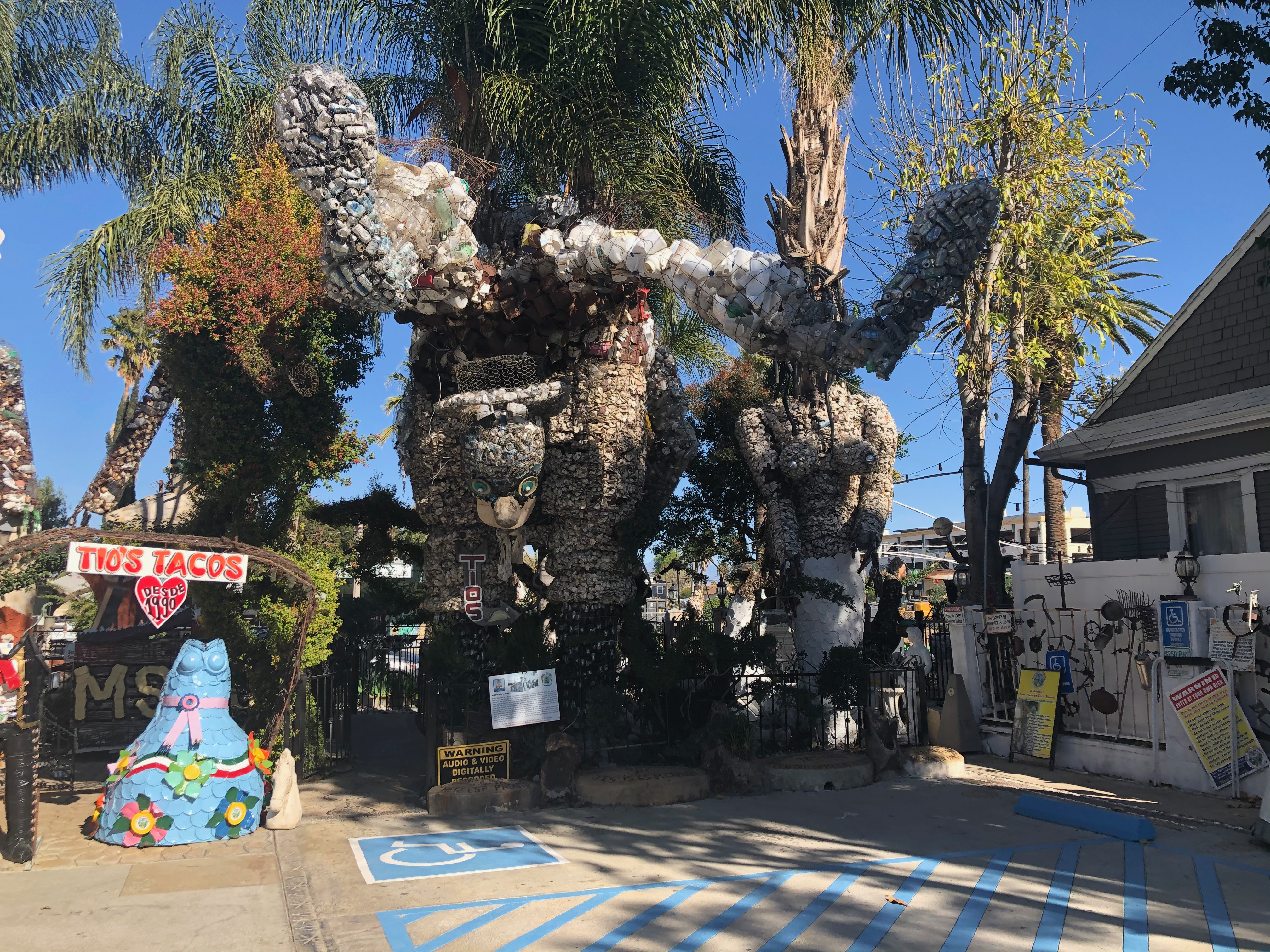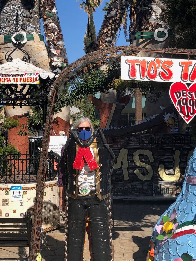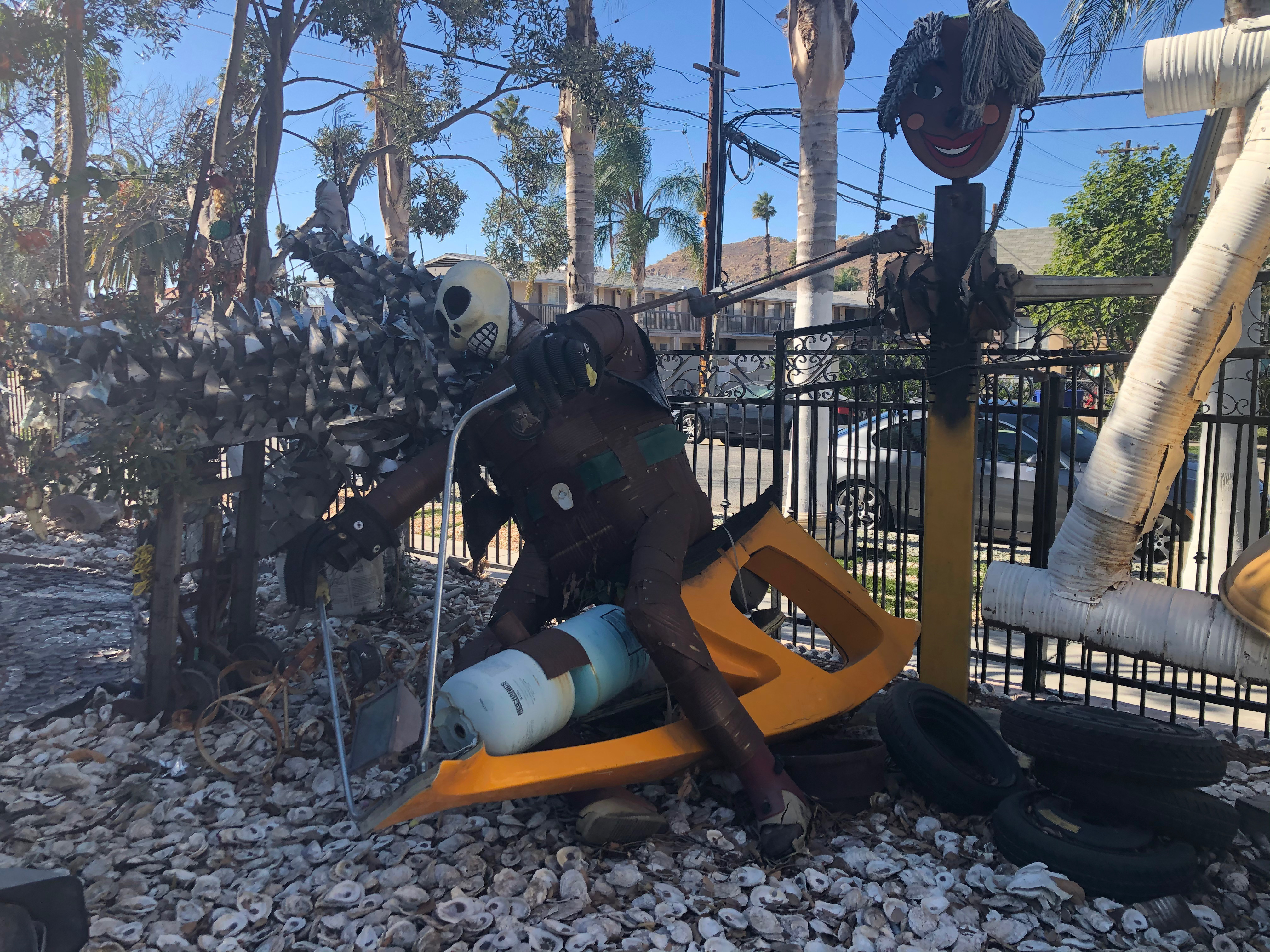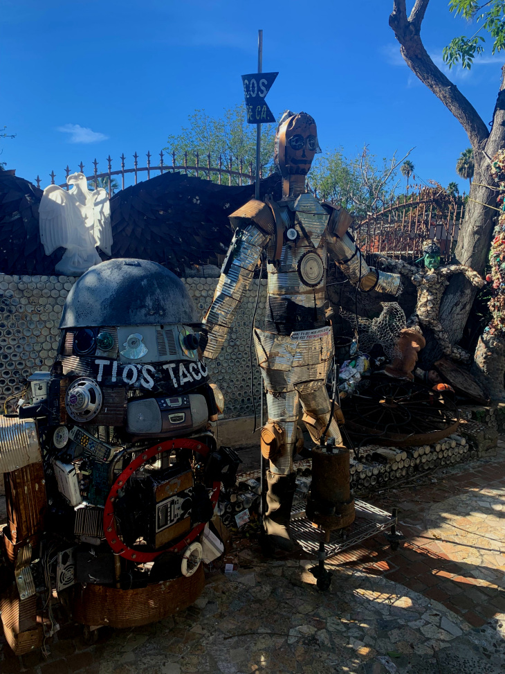 That first statue, a woman made from bunches of small toys wired together and wearing rows of Barbies as a dress, still stands on the outskirts of the restaurant’s patio. Fast forward to today of the more than one hundred artworks, just steps away from the Barbie statue are two life-sized figures of Star Wars droids R2-D2 and C-3PO, made from boom boxes, old remote controls and aluminum cans.