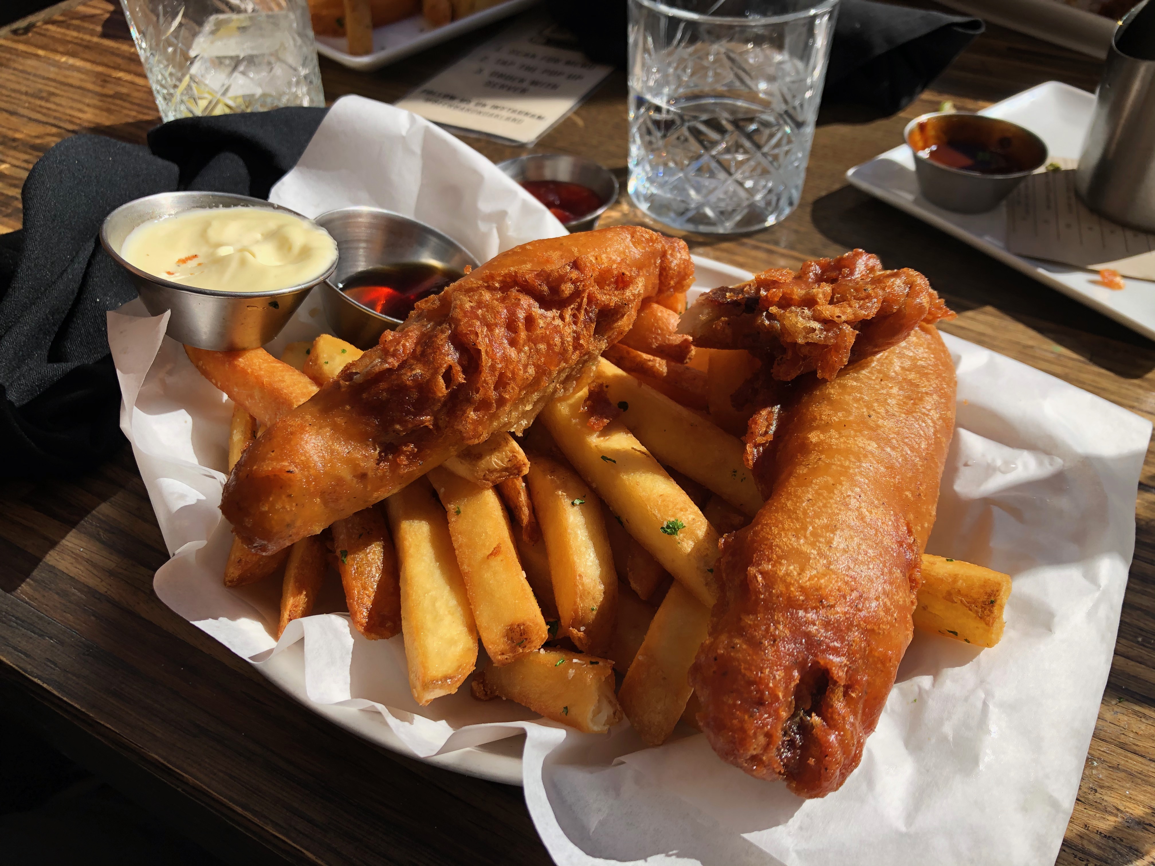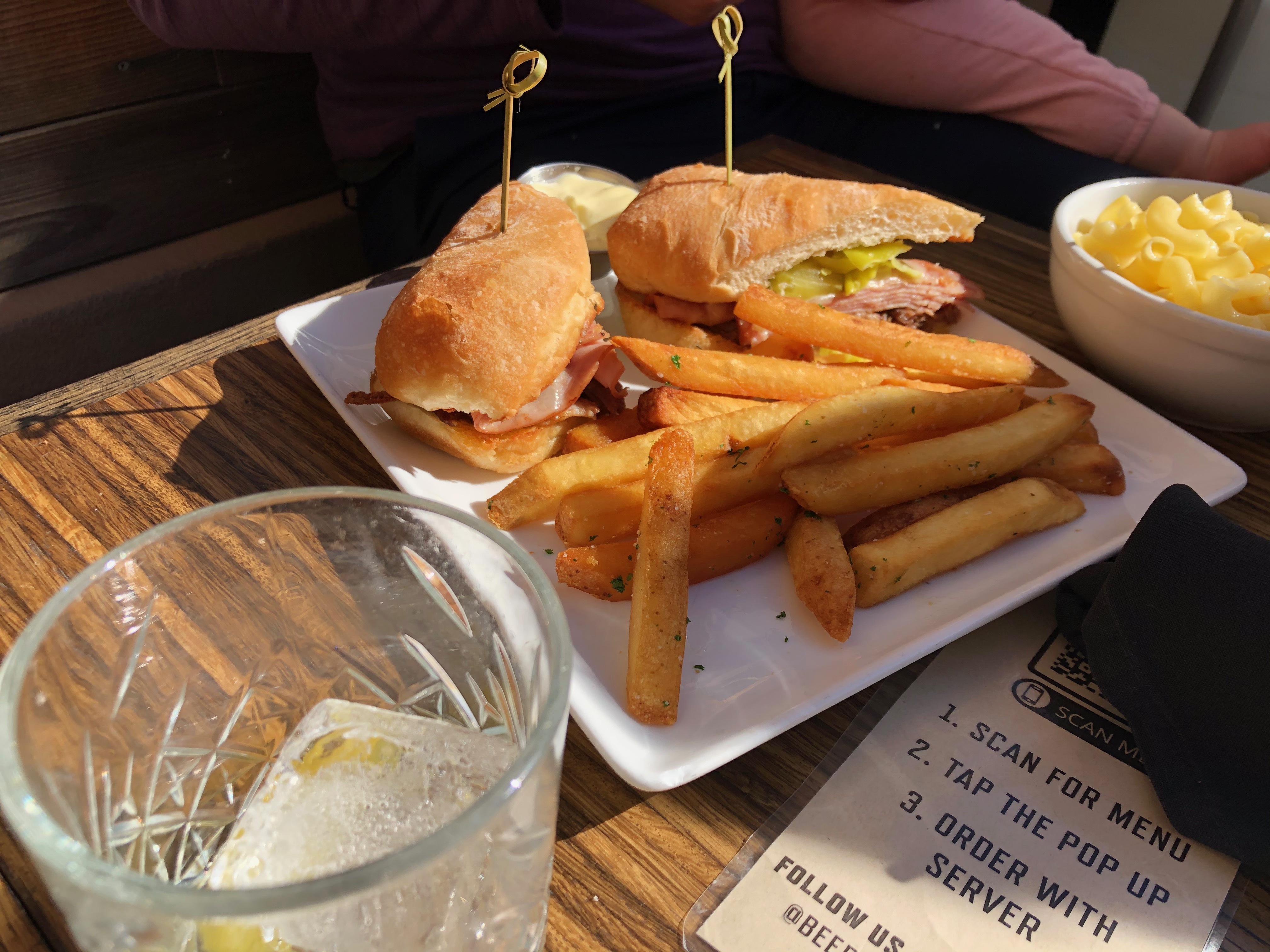 It was a warm day sitting in the sun and glad to be out in public, we entertained ourselves by watching Gemma wiggle in her baby carrier attached to Kris and the other patrons enjoying time out of doors after the long lockdown. Soon Jessica joined us and along with another round of drinks Kris ordered the El Cubano (Toasted Ciabatta, Roasted Pork, Ham, Monterey Jack, House Pickles and Mustard) sandwich while Joanna and I split the excellently done Fish and Chips (Beer Battered Tilapia Filet, Duck Fat Fries, Cabbage Slaw, and Beer Mustard Remoulade). Normally I’m not a fan of thick French fries but these were likely double fried and combined with the Duck Fat made for a crisp exterior and rich taste.