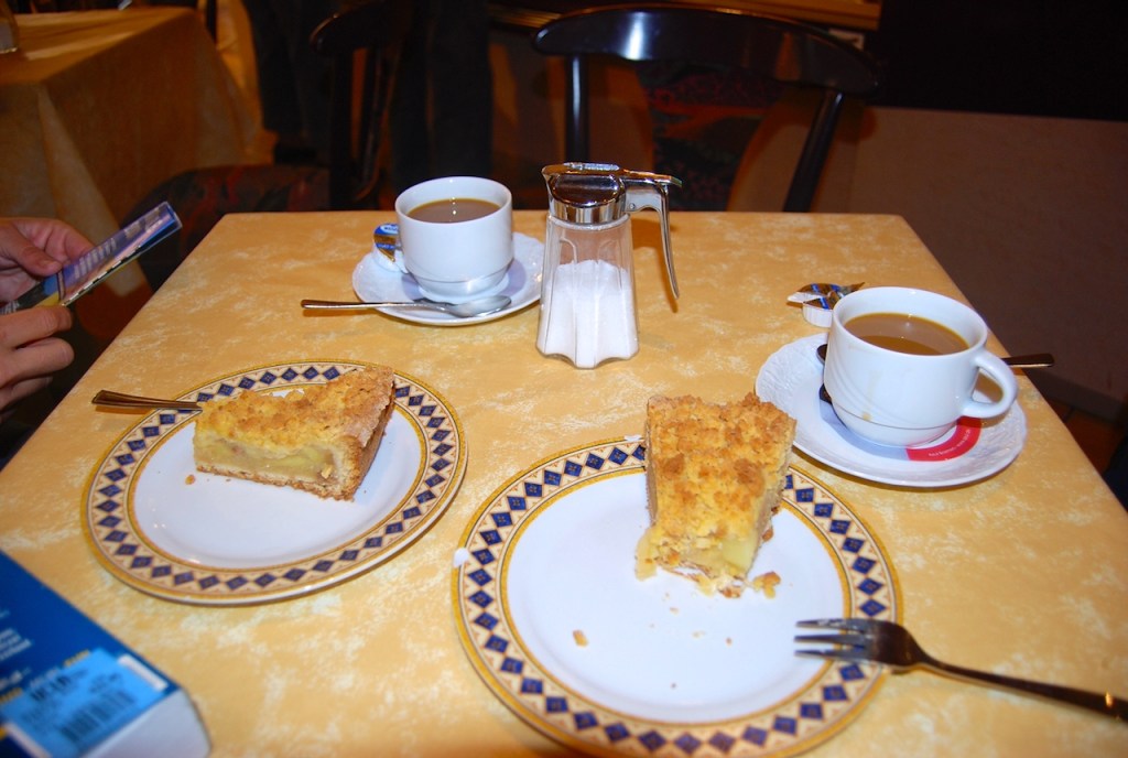 We’ve used Frankfurt, Germany as the gateway for short and long European trips (1984. 1992, 1999, and 2007), opting each time not to spend the first night there, but instead in a smaller village an hour or so drive away (Giessen, Rothenberg, Wurzburg, and Bacharach, respectively. And each time our first stop after arriving was to consume, in no particular order a Currywurst, beer, and a piece of Apple Strudel.