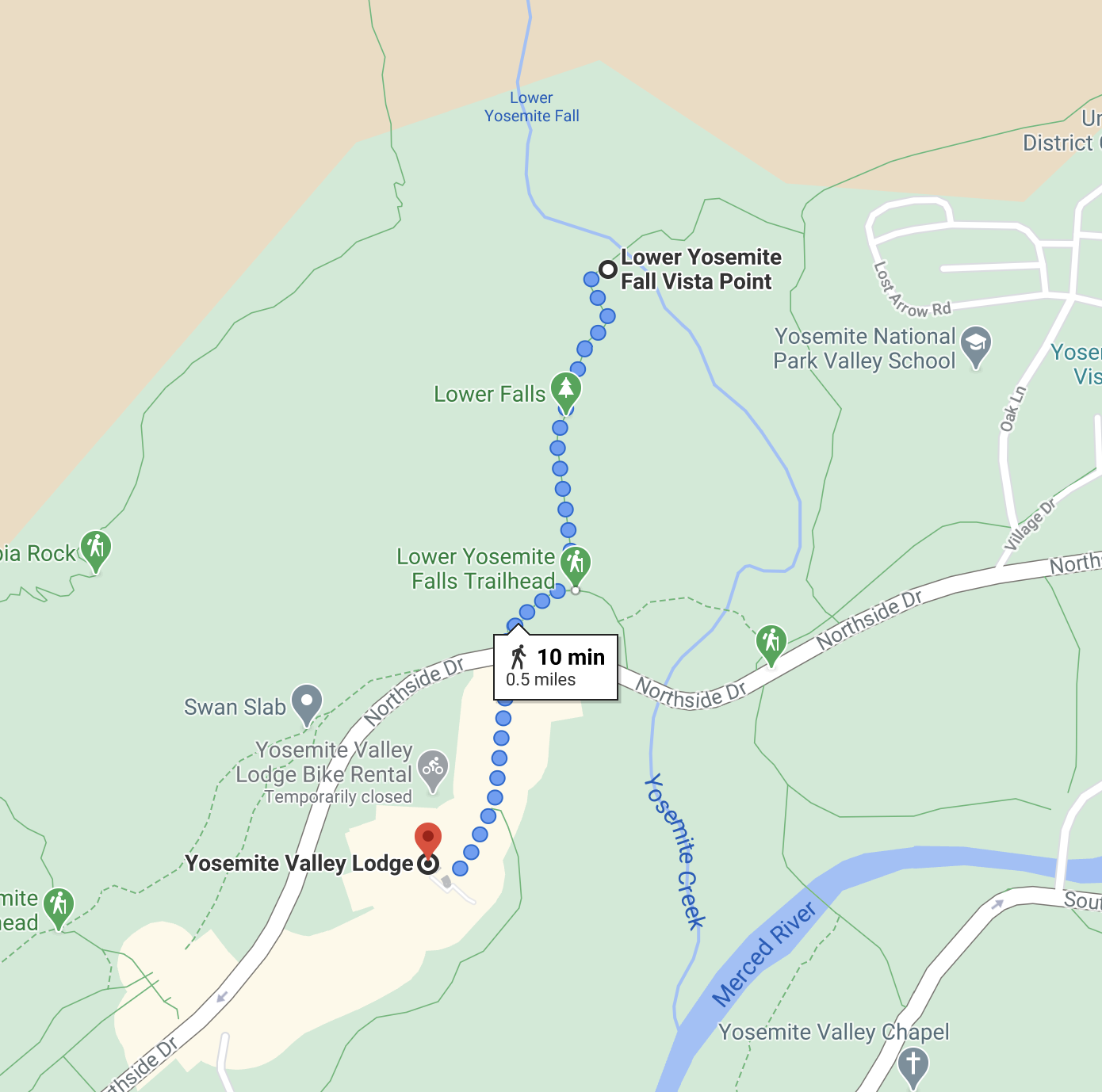 There was quite a bit of construction going on as we entered the park, primarily a new pipe being installed on the road in, obstructing traffic a bit but with the one downside that they were using the parking lot at Bridal Veil Falls for lay-down and thus the area was closed. We motored on, arriving at Yosemite Lodge where we’d stay for the next three nights.