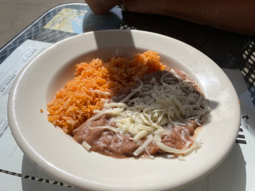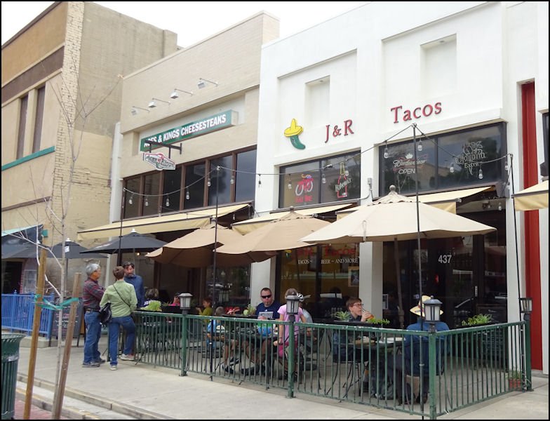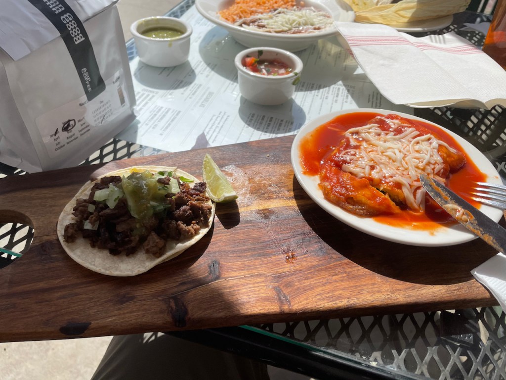 Unsure of our food options in Yosemite, we decided it would be best to eat a hearty meal in Merced before heading westward to the park and so after some online sleuthing, Joanna found us a bonus stop in the middle of downtown at J & R Tacos on Main Street. We’d arrived a few minutes before they opened, which gave us a chance to review the menus that were mounted on each of the outdoor tables in front of the restaurant.