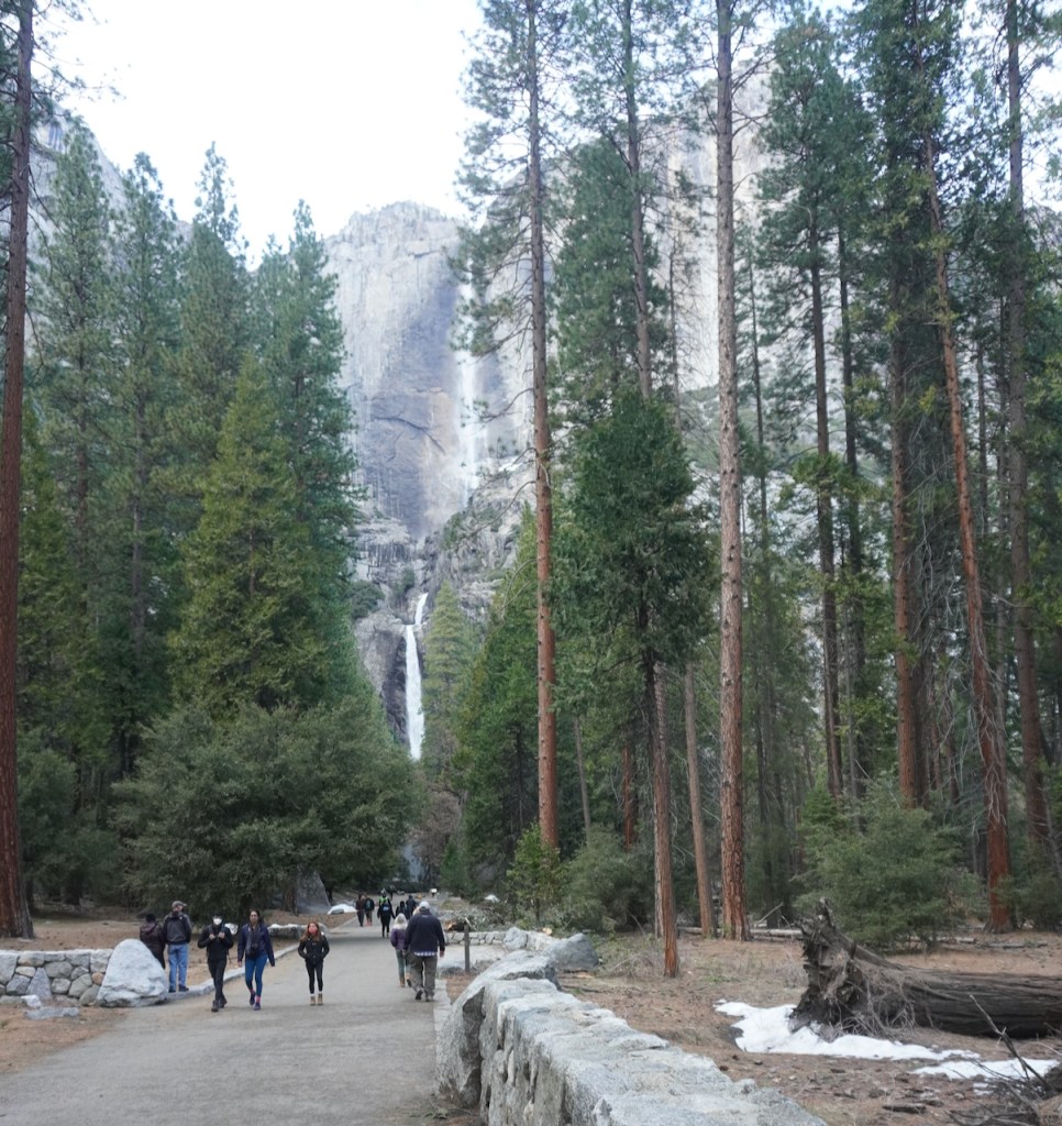 After unpacking and getting set up, we used the last waning hours of daylight to walk the half mile to the Lower Yosemite Falls Vista Point. How many times have we taken in this view, during high and low water, in summer, spring and winter? Too many to recount and yet each time regardless of the water level one is reminded of the power of nature.