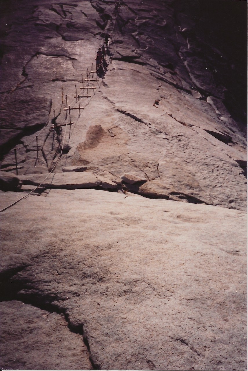 On the third day we pitched camp early in a site that had been used many times before (a rule in the backcountry is to try to always use previously camped in spots so as to minimize your impact) near the base of Half Dome, our destination for the day. We hiked up the trail to the base of the dome where we sat for a while staring at the ascent to the top, parallel stanchions planted in the granite with a two by four between each and a metal cable laced through eyelets at the top of each stanchion, a cross between steps and a ladder.